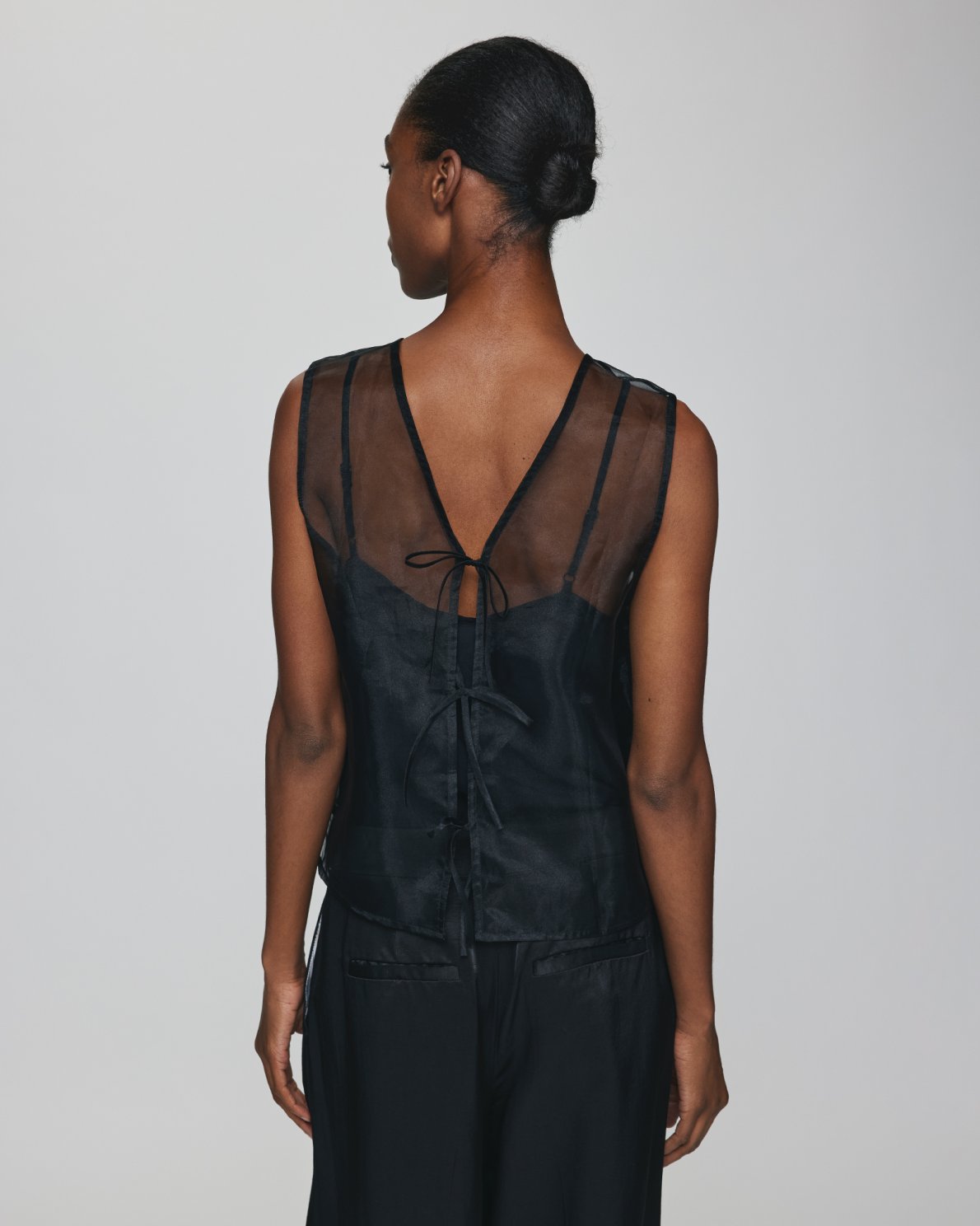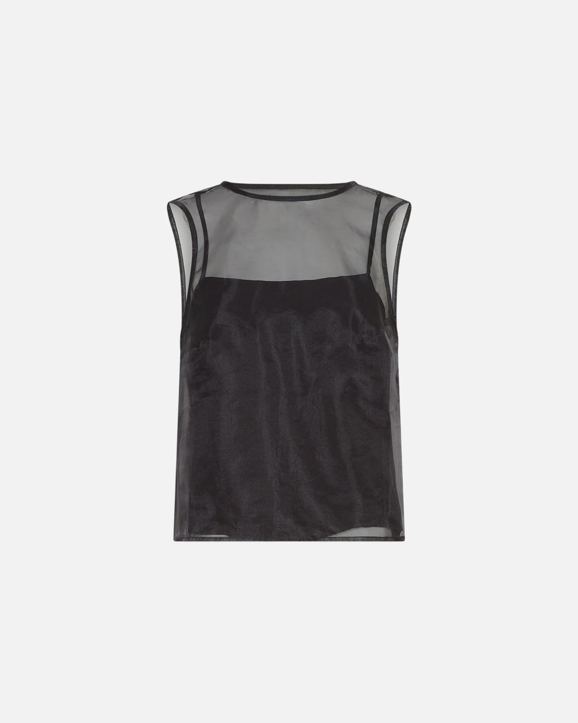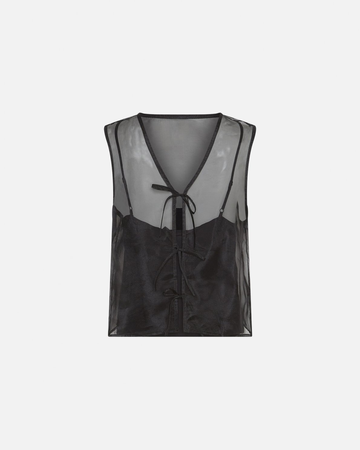 The Lita Top top is a sleeveles top in a thick mesh quality. The top features a round neckline with a low cut on the back with a bow detail. It comes with the black petticoat top. This top is ideal for a night out styles with a pair of cool jeans or suit pants.