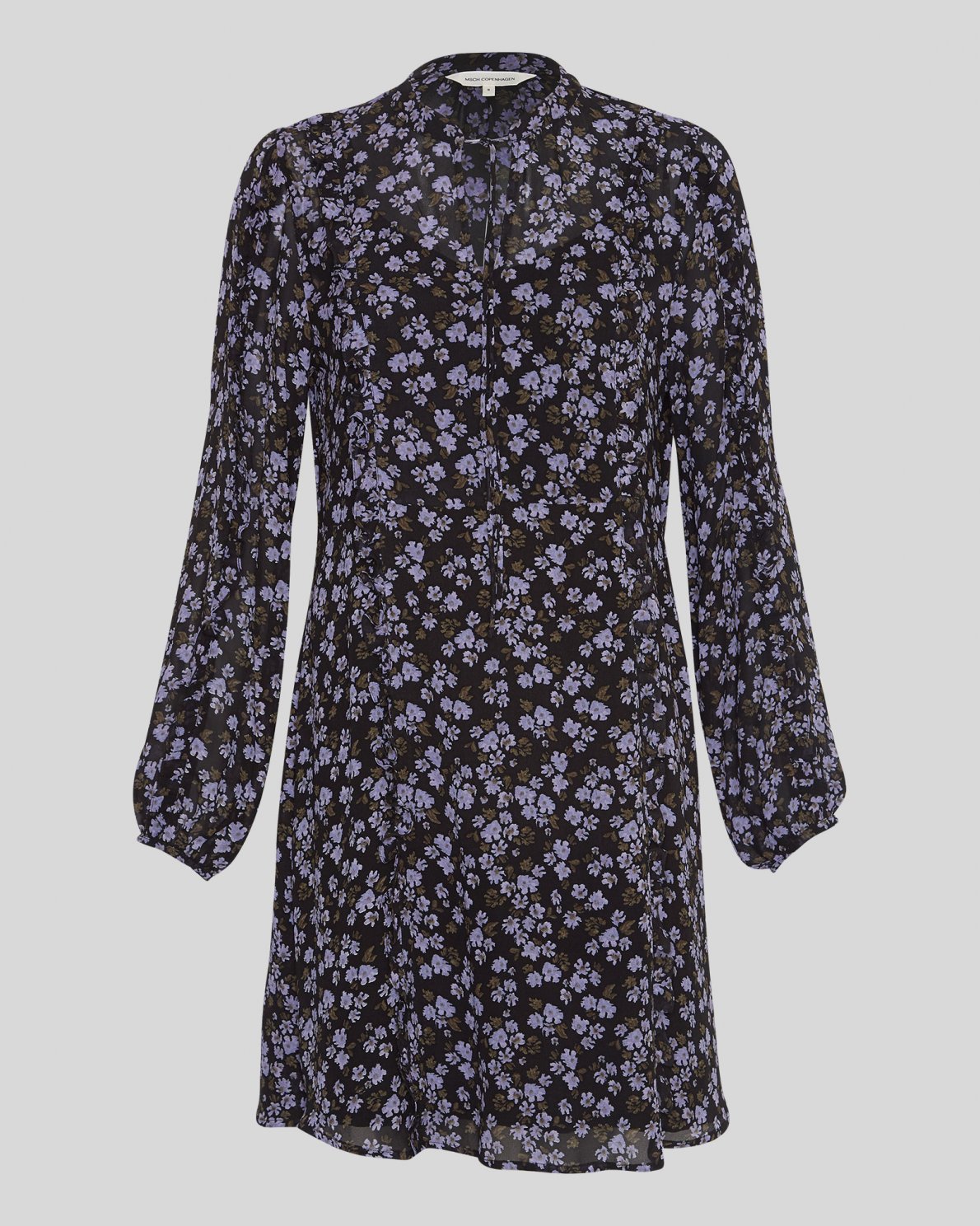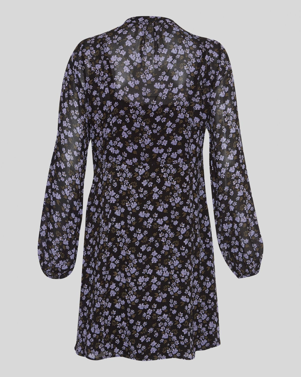 A classic style here at MSCH, our beloved flower printed dress with a simpel round neckline, a half placket and long sleeves with a slim elastic cuff. This time the floral print is small and in a purple colour with black as its base colour. The dress features an outer layer, which is the floral layer, that's slightly seethrough and with a black pettycoat underneath to ensure coverage.