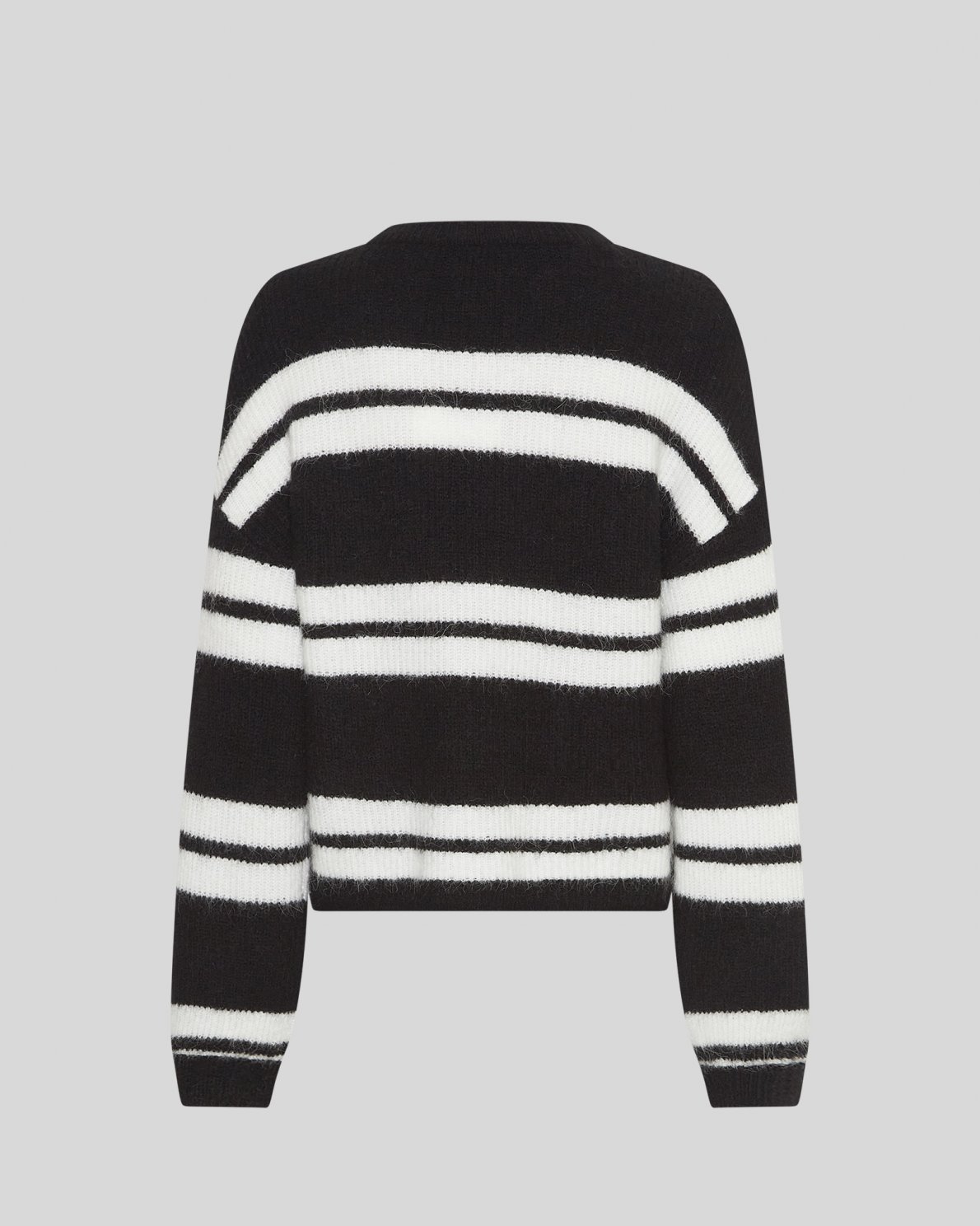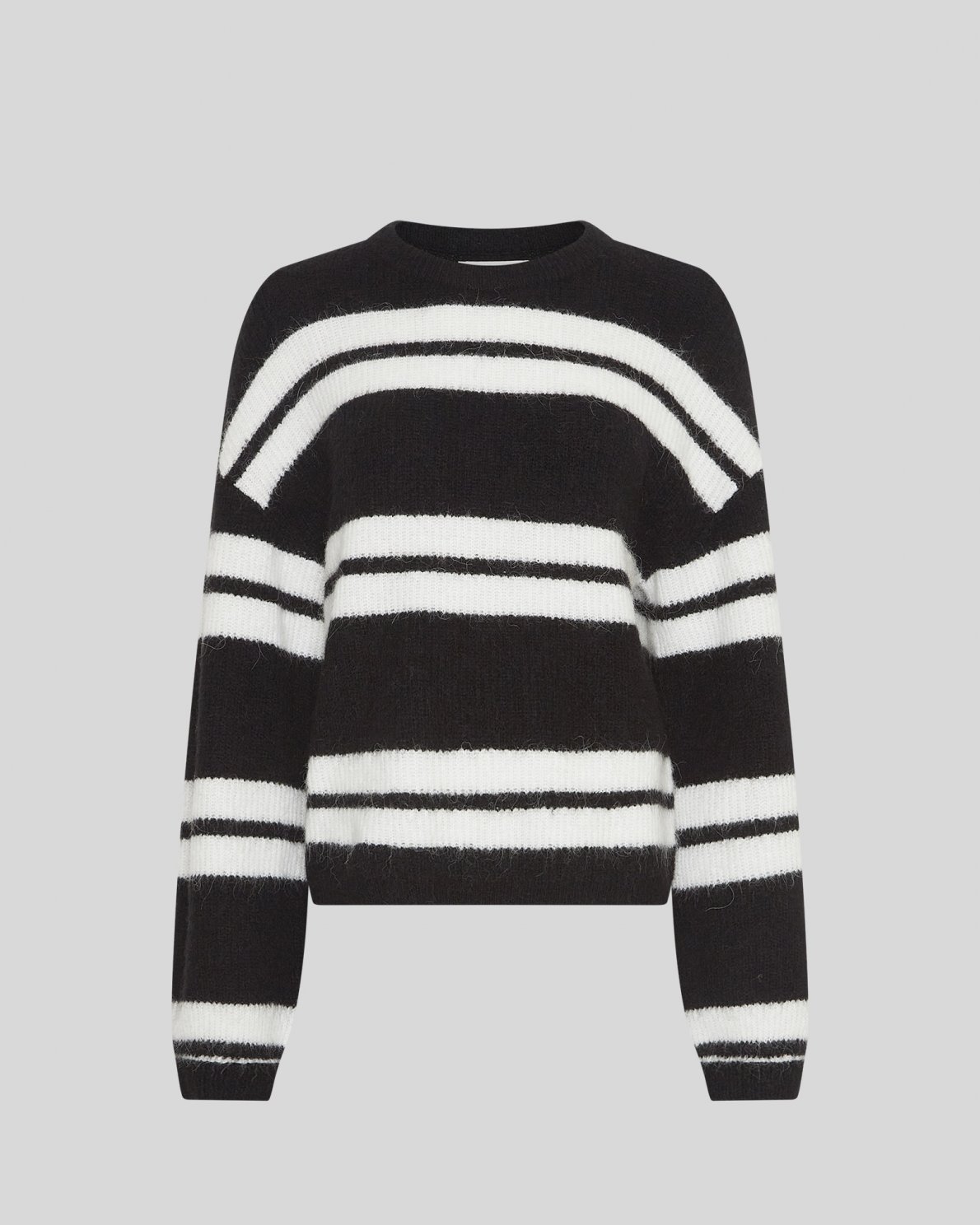 A timeless MSCH Copenhagen knit pullover with stripes. Crafted from high-quality wool and alpaca blend, this pullover offers exceptional warmth, softness and durability. Its cozy structure makes for a perfect companion for chilly days, ensuring you stay both warm and stylish. The dropped shoulders and the rib knit cuffs provide a relaxed and easy-going vibe.The round neckline adds a touch of simplicity, making this pullover a highly versatile style. Pair it with an elegant shirt underneath for a formal outfit, a pair of relaxed fit jeans or your favorite long skirt. Elevate your style with this cozy essential.
