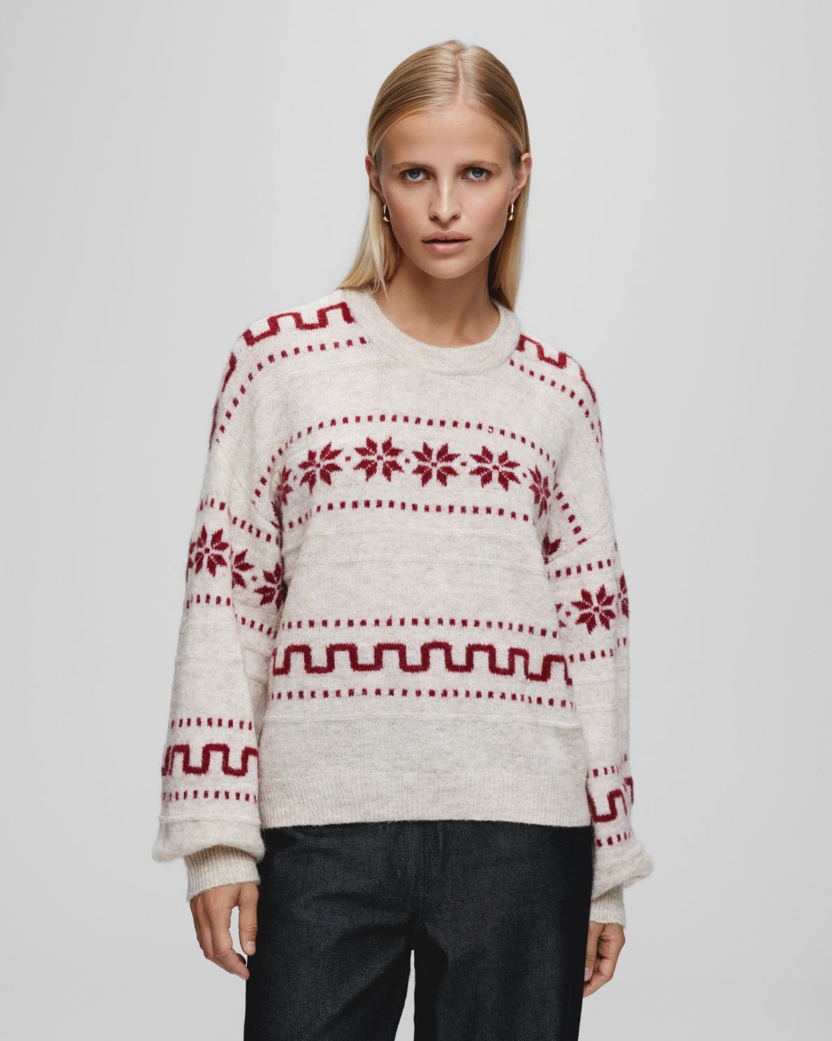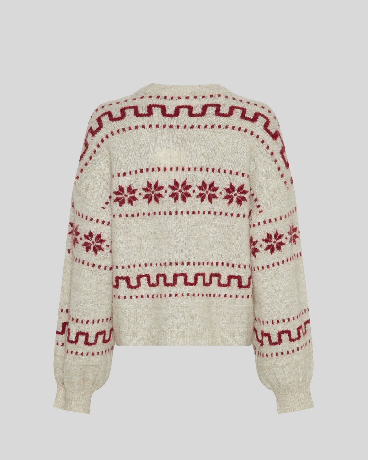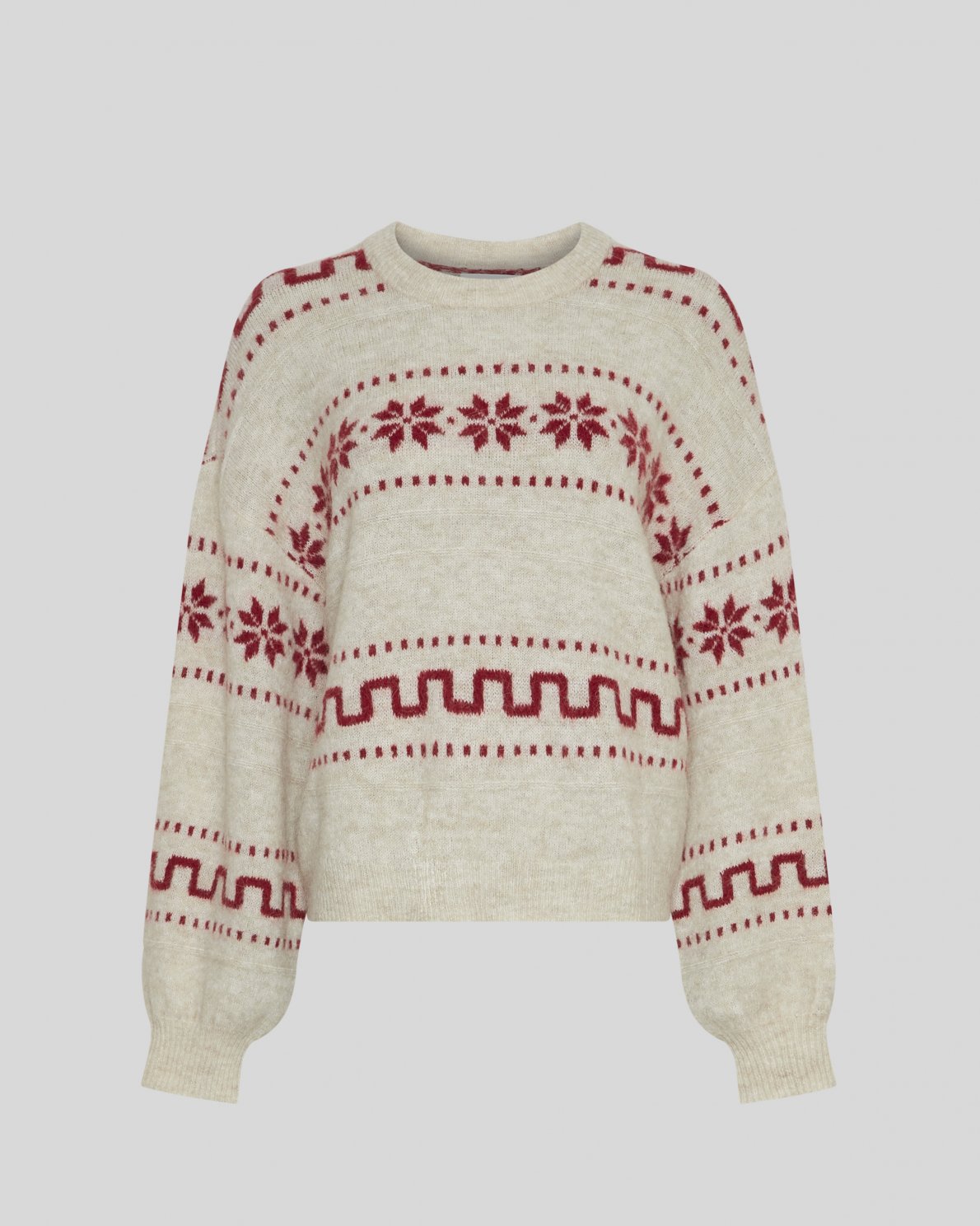 The Lerato pullover, is a classic interpretation of a Nordic Winter sweater. It's soft beige base mixed with the dark red pattern gives a cosy feel to the pullover. The pullover features a classic round neck and loose sleeves.