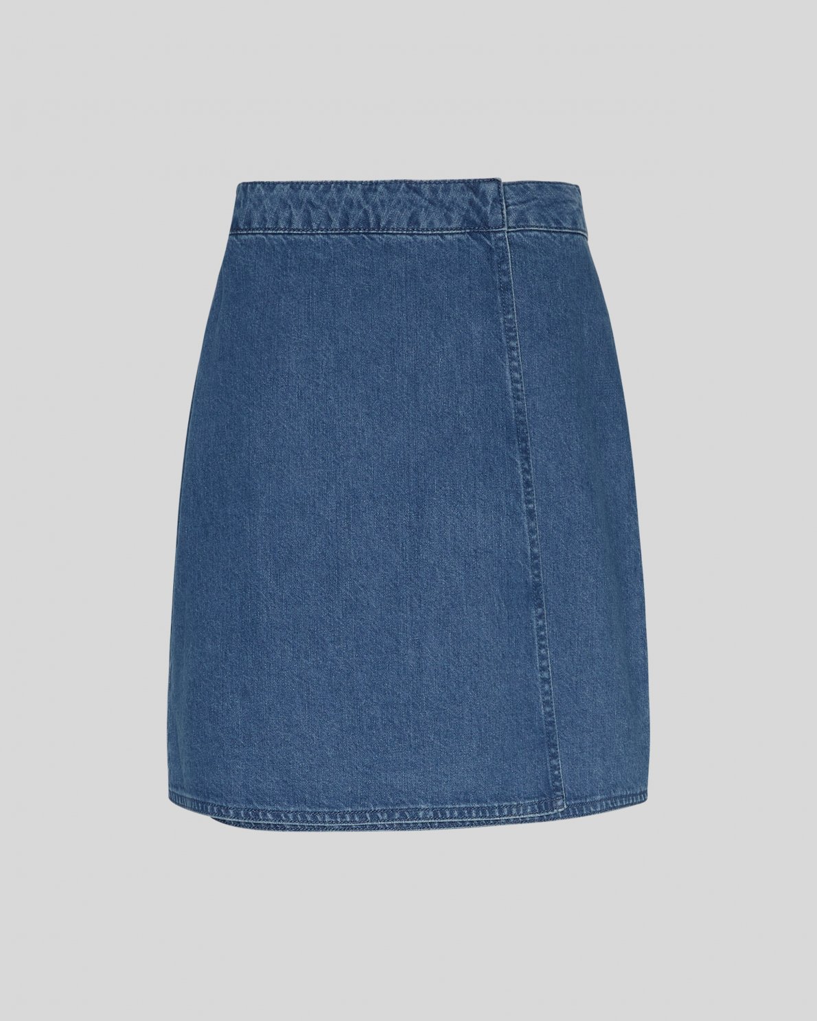 Elena is a soft denim quality, in a blue washed colour. This skirt is a mini skirt, and features a wrap design, with a button closure. It's edgy and cool. Style it with the matching denim jacket and a pair of high boots.