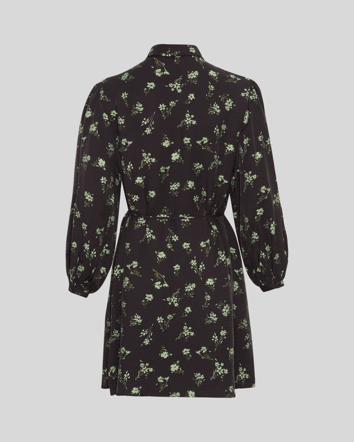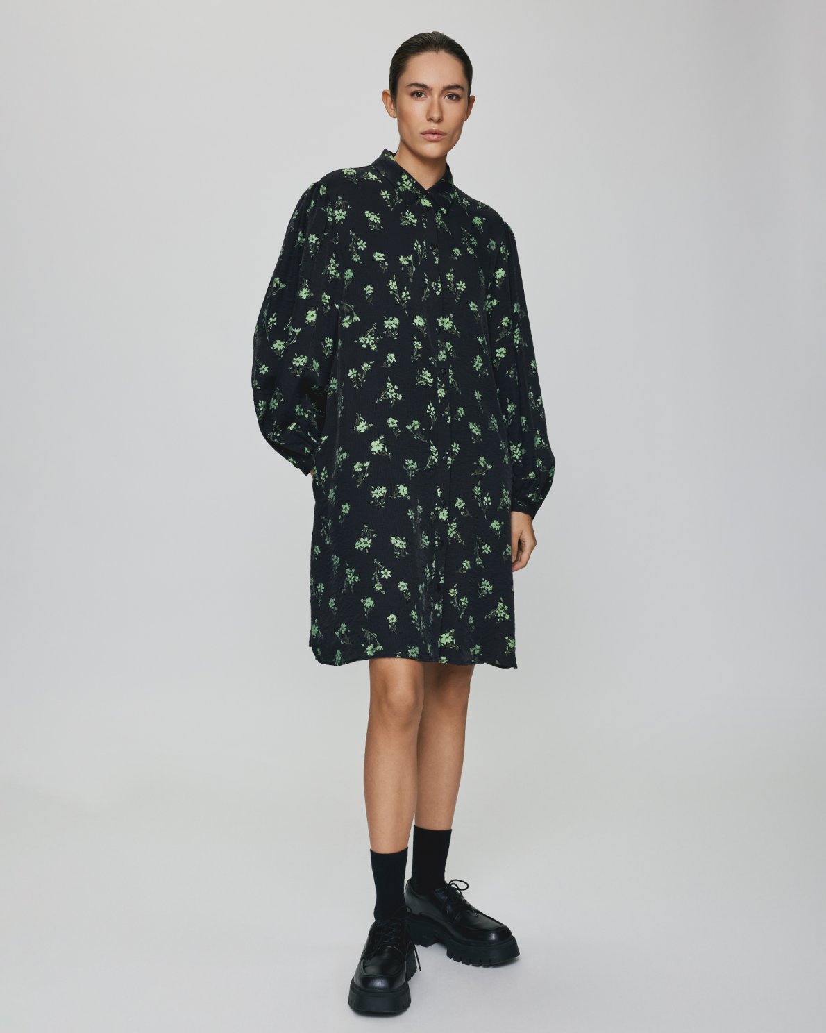 Jusine is a shirt dress that features a classic shirt like collar, hidden side pockets and a subtle puff sleeve. The dress comes with a small belt that can be used to tie around the waist. The print is a soft green floral print og a black base.