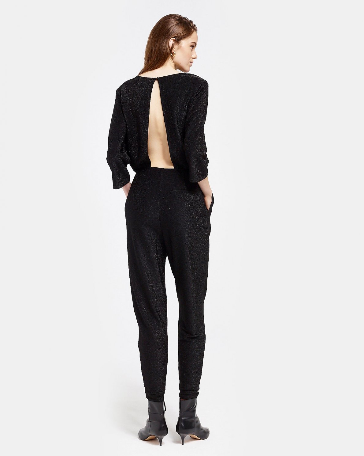 Shiny jumpsuit with a waitsband at the waist and a opening on the back
