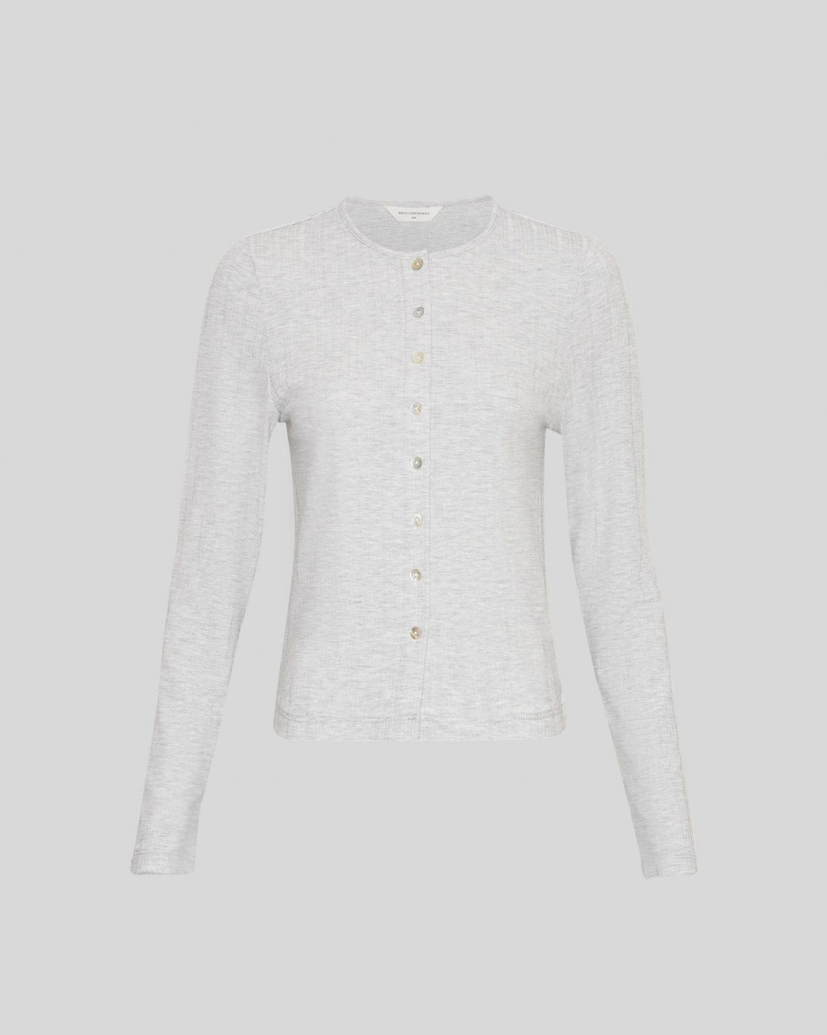 Die Juna Strickjacke ist dünn, leicht gerippt und eignet sich perfekt als Alltagsoberteil. Sie hat kleine Perlmuttknöpfe.
