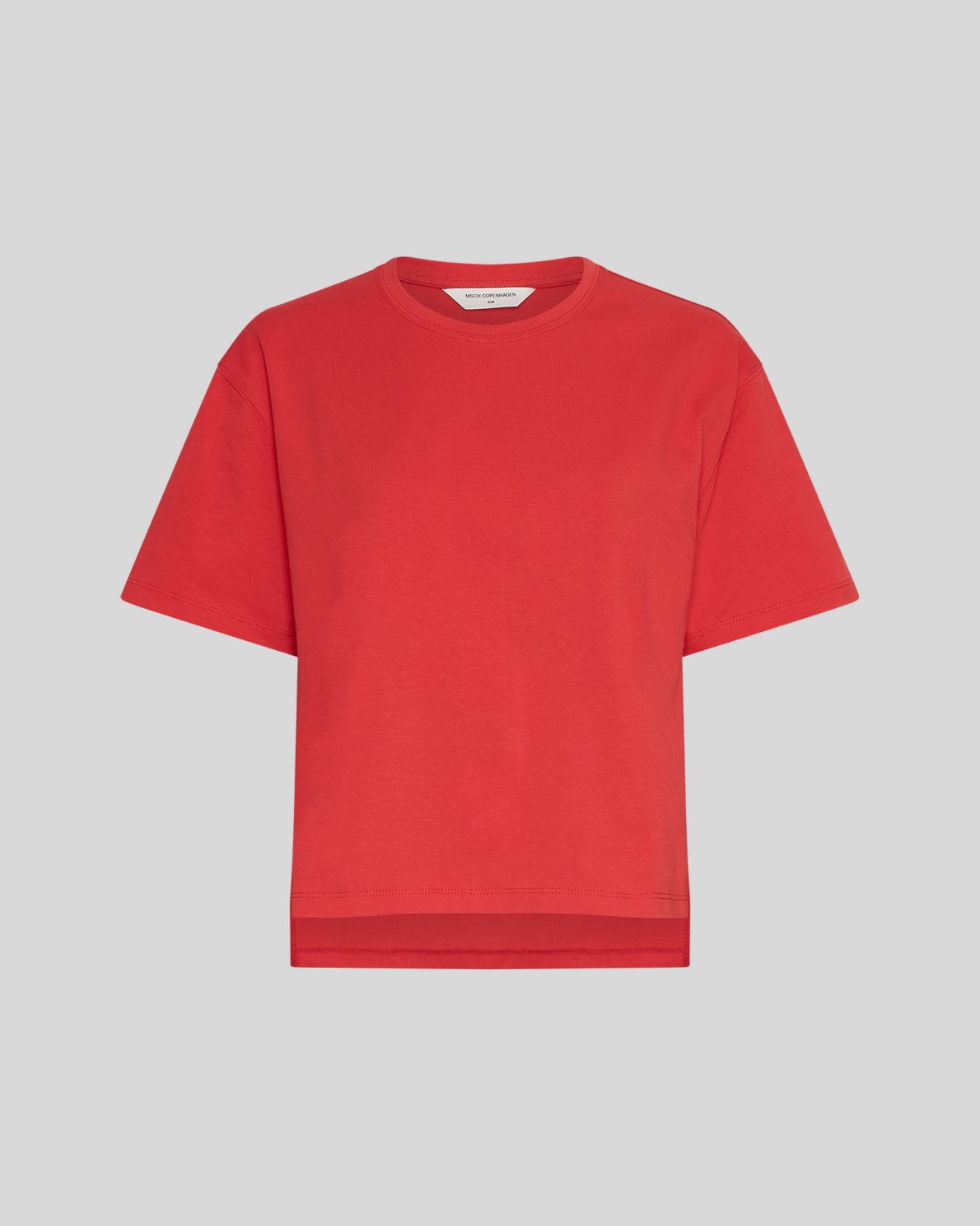 A classic, heavy cotton t-shirt with a round neckline and two small side slits, adding a bit of extra life to a simpelt t-shirt. The T-shirt is a bit longer in the back compared to in the front. This is perfectly styled with a pair of jeans for a causal fit.