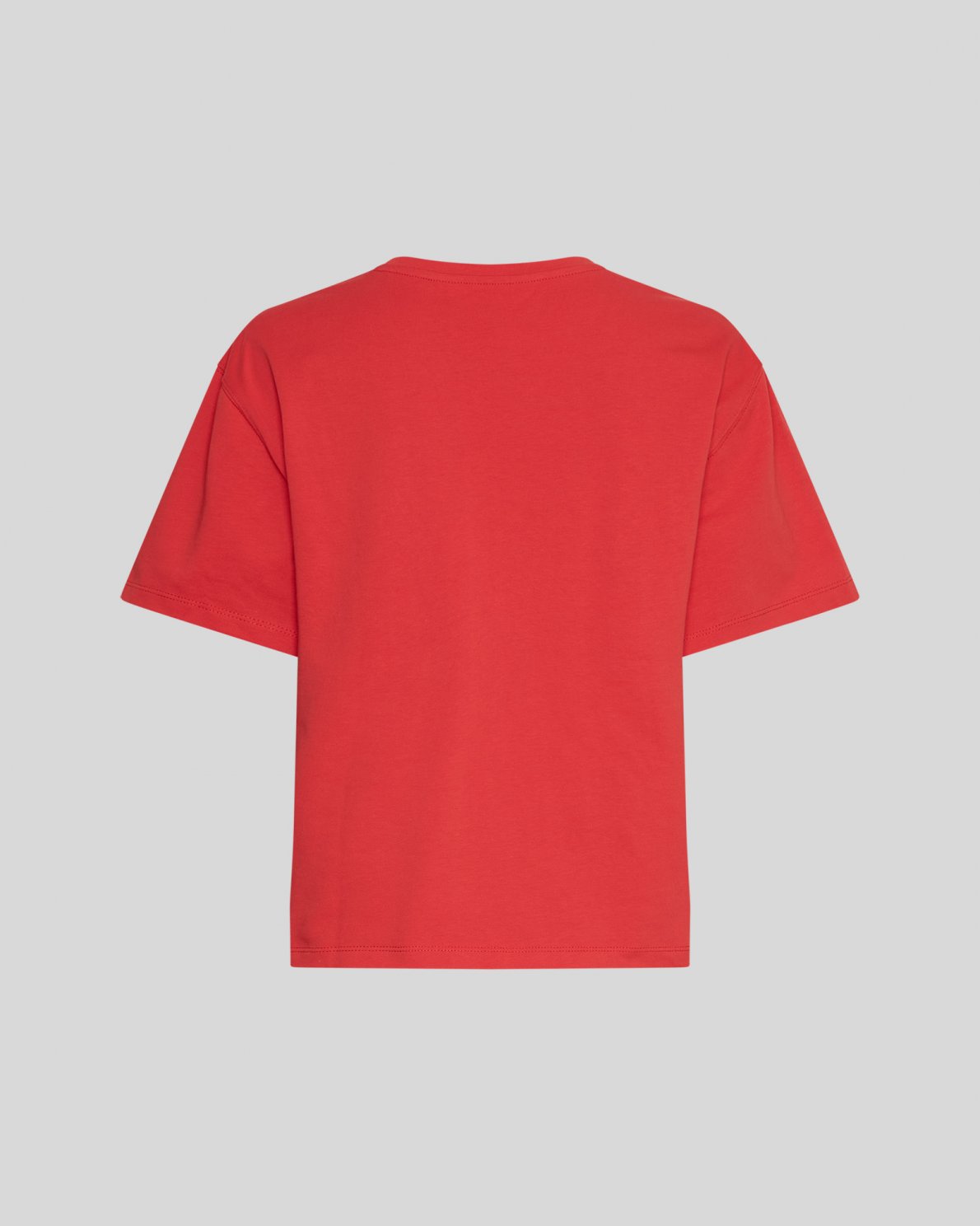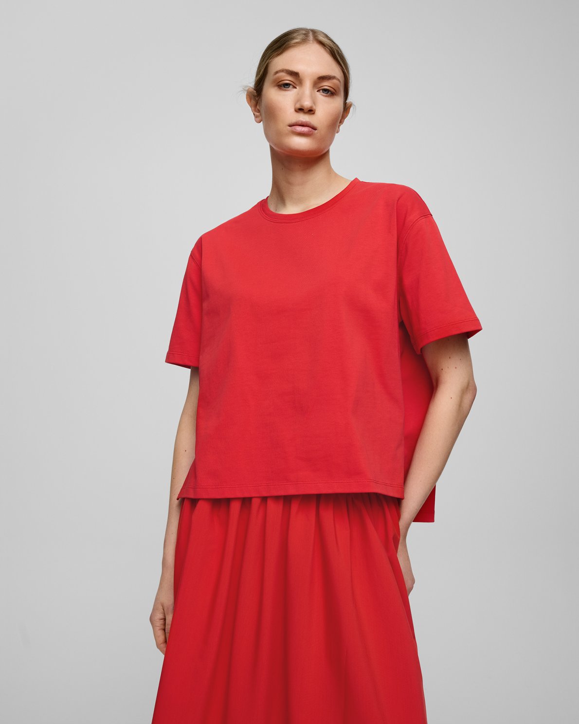 This t-shirt has a boxy fit. The model is 179cm and wears a size S/M.