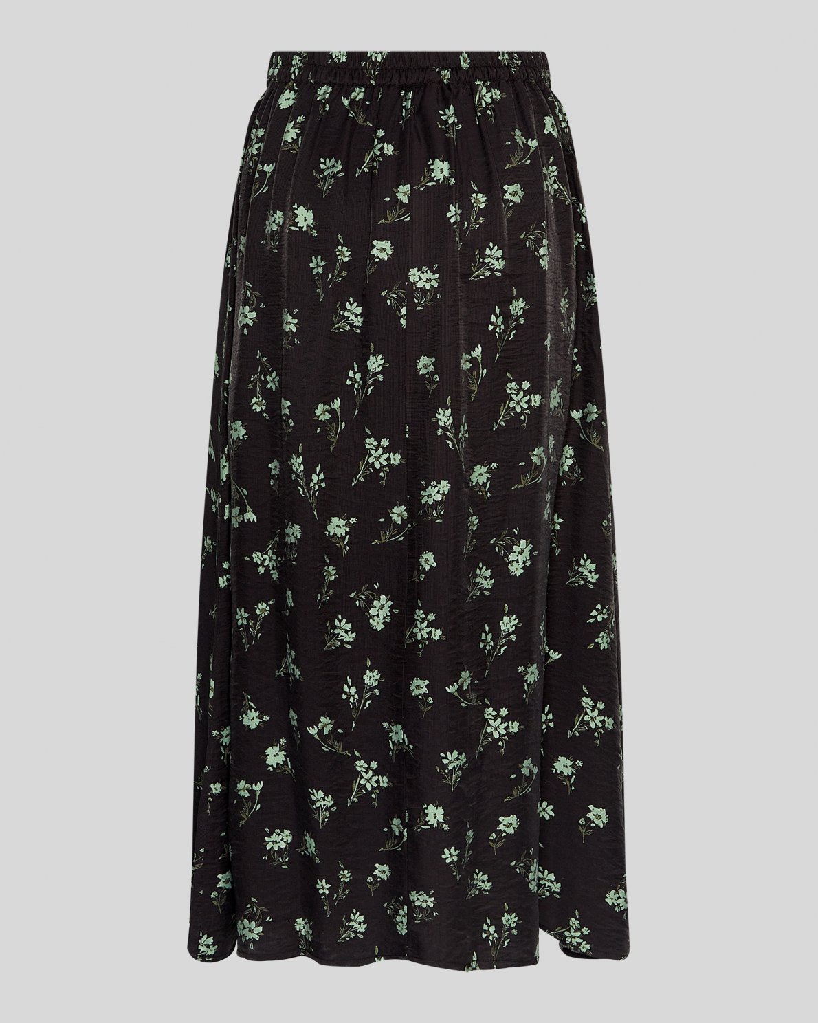 The Jusine skirt is a floral printed maxi skirt. It has a smple design, with its elastic waistband and flowy skirt. It's great in all seasons due to the mixture of the black base and delicate green flowers.