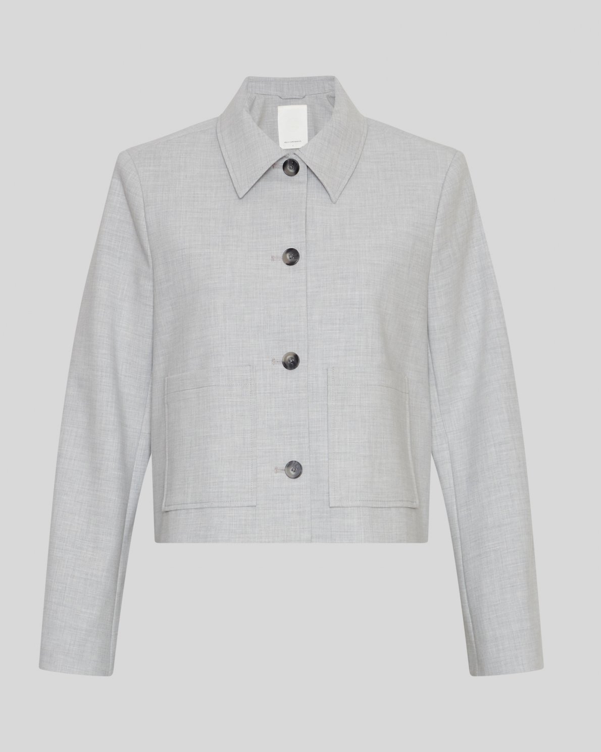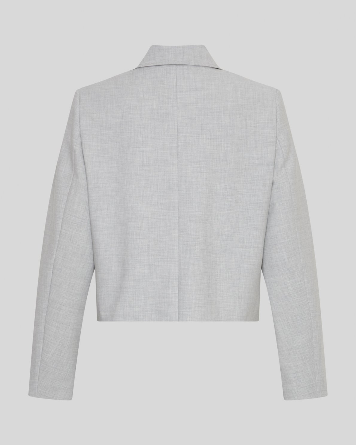The Henrike blazer, is a short, ligh weight blazer with dark buttons contrasting to the light grey colour of the blazer, and big front pockets. The blazer matches the Chane Straight pants.