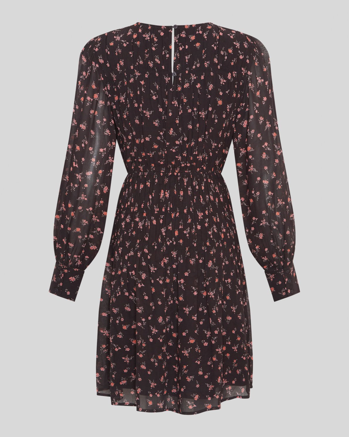 Kurzes Kleid mit Mesh-Außenlage und schwarzem Unterkleid. Das Kleid hat lange Ärmel mit breiten Manschetten, einen runden Halsausschnitt und einen elastischen Bund in der Taille. Kleine Knöpfe befinden sich auf der Vorderseite.