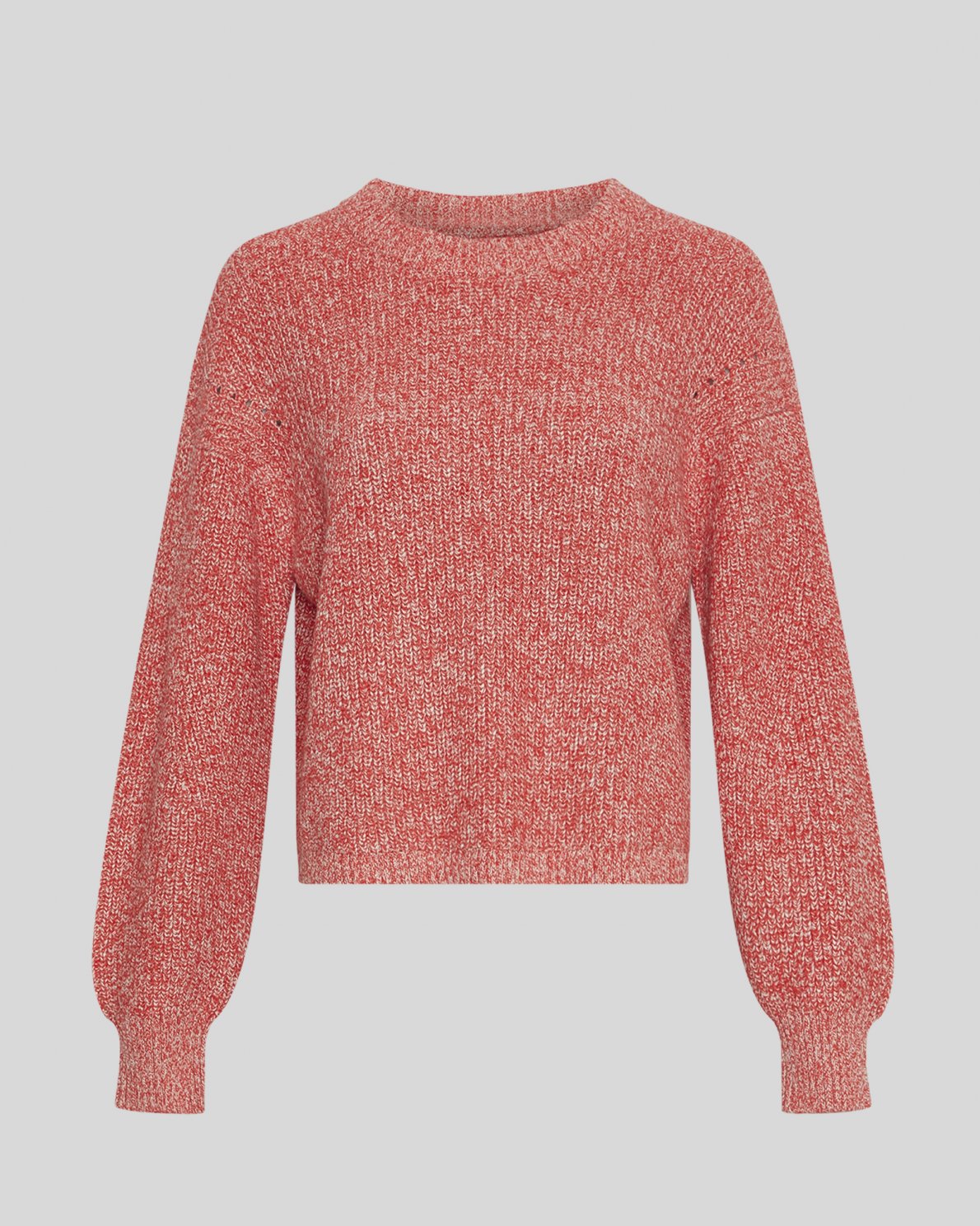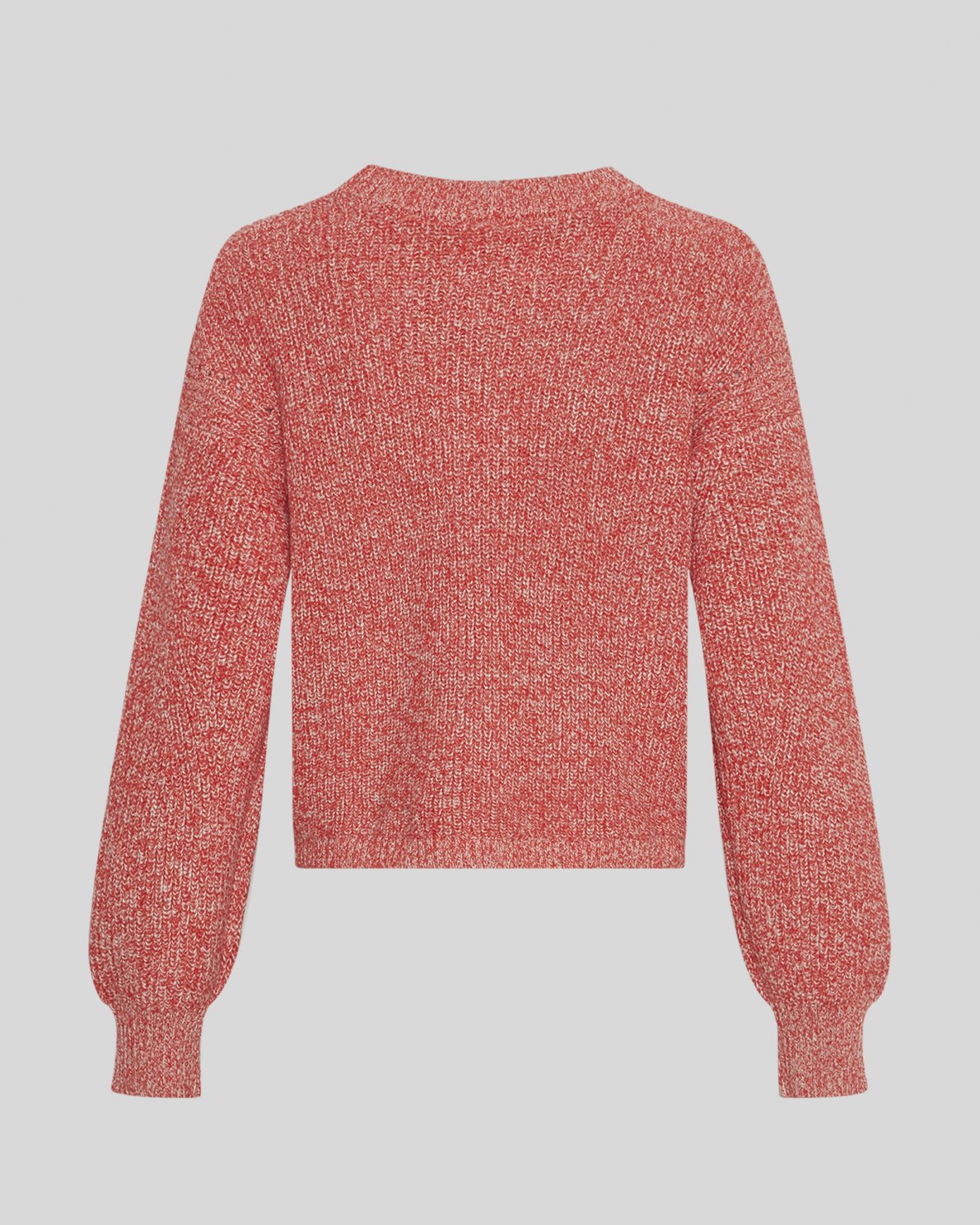 A knitted pullover with a round neckline, dropped shoulders, and a wide ribbed cuff that together creates a bit of a balloon sleeve. It's a double coloured knitwear that features both a white and a red nuance.
