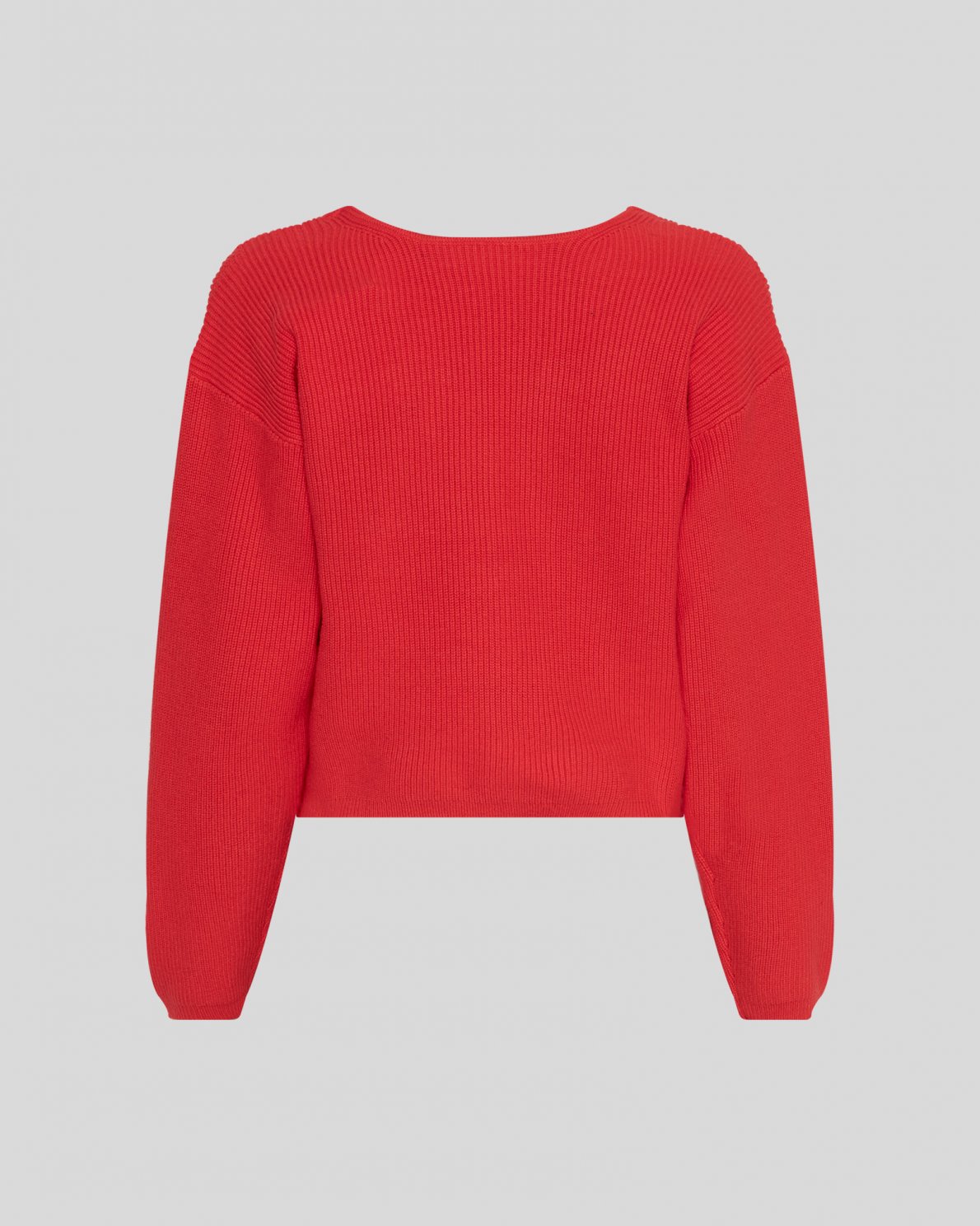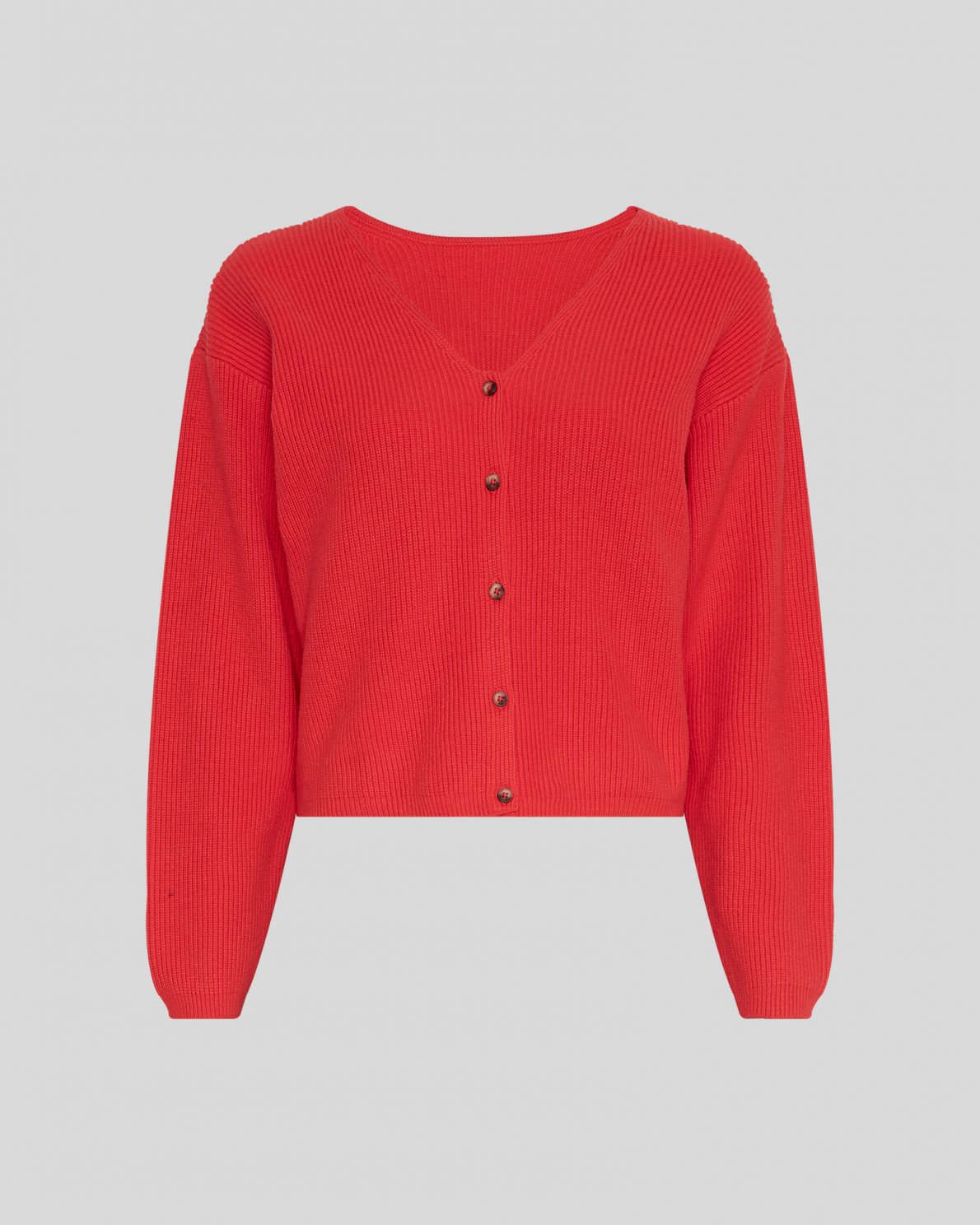 The Klaka cardigan is a reversible cardigan that can be worn both ways round. One neckline is round and the other is a deep V-cut with a row of small buttons. The cardigan has dropped shoulders to give the expression of a loose and oversized fit.