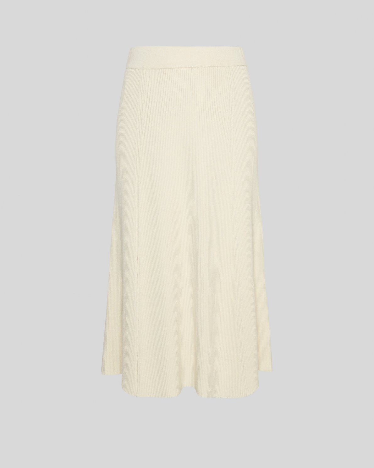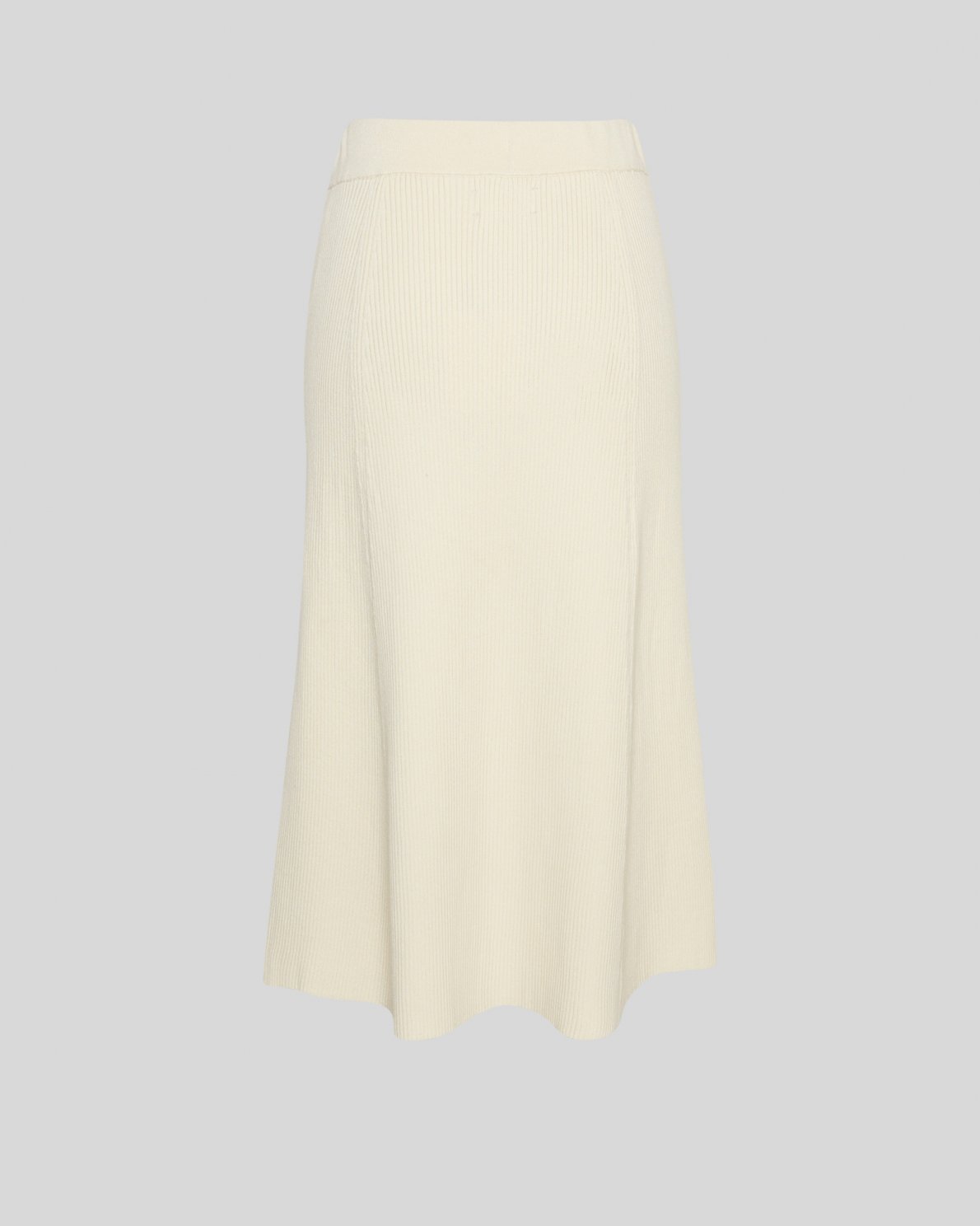 The Hille skirt is a maxi skirt, in a heavy rib knitted quality. It features a slight a-shape and has an elastic waistband.