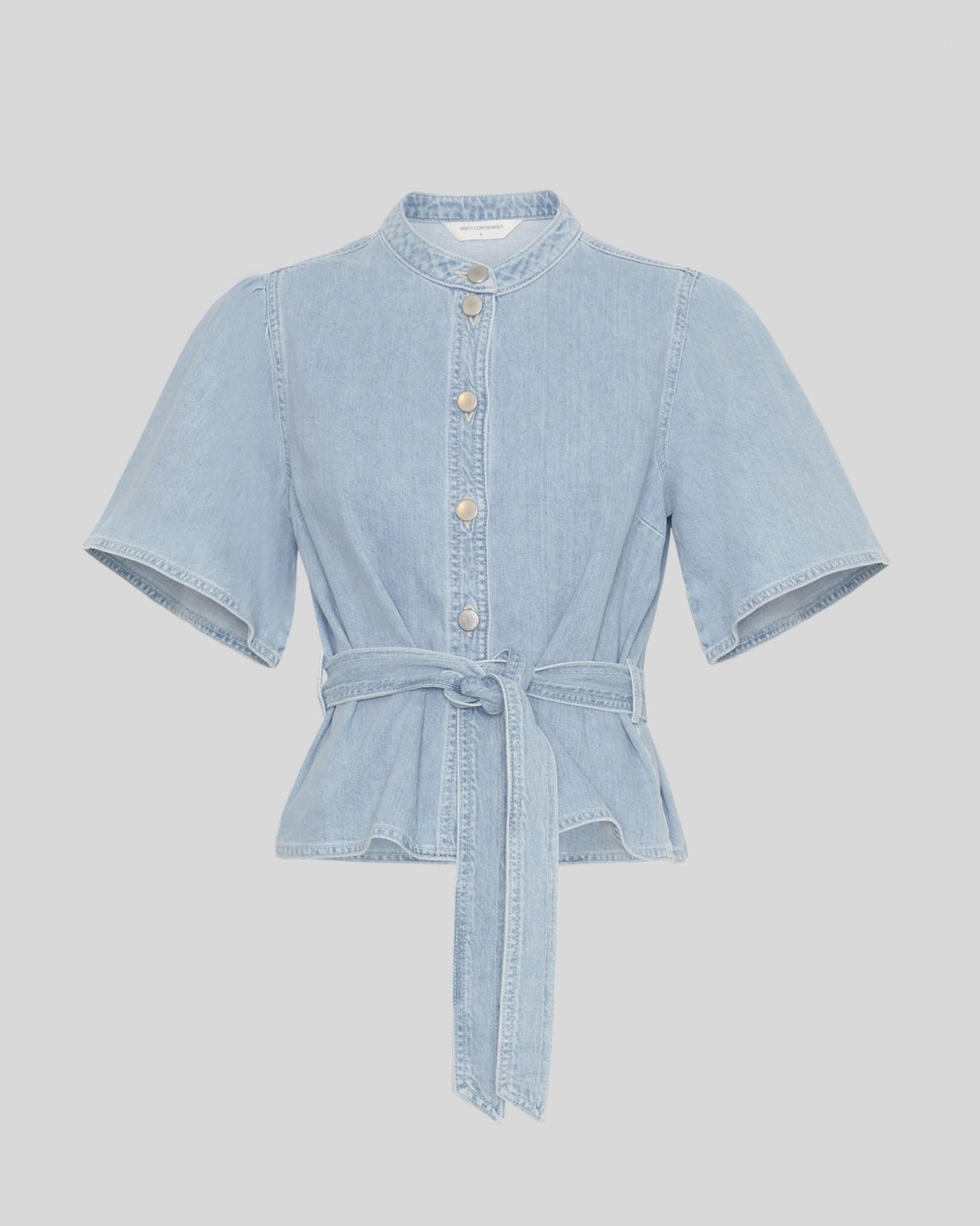 The Ingrid Lis shirt, is a short shirt in a soft denim quality. The shirt features a mandarin collar, loose sleeves and a belt to tie around the waist. It is a matching set with our Ingrid Lis Jeans.