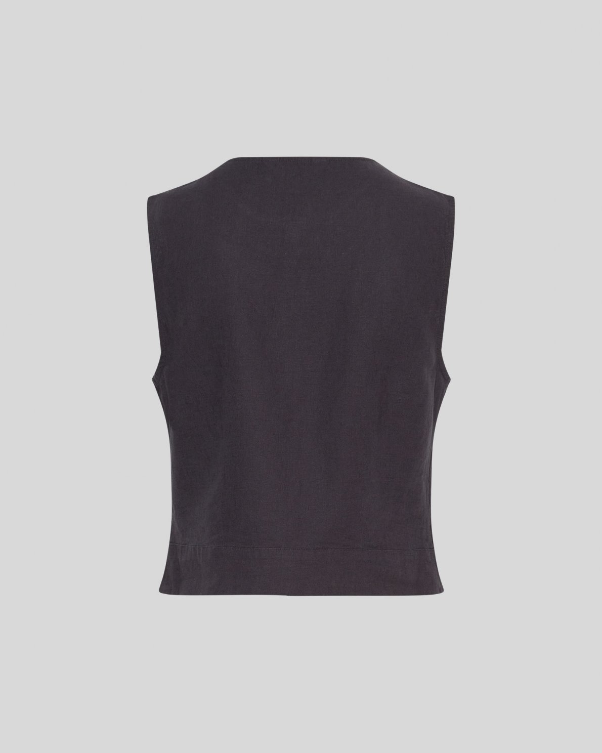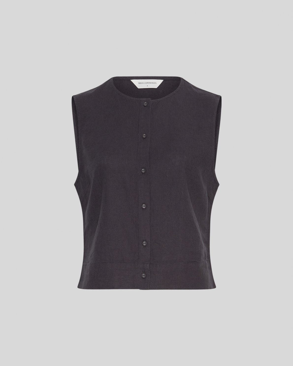 A lightweight summer top with front buttons to add versatility to your style. It features round neckline with a nice linen structure. Select a matching linen piece to complete your look, or tone it down with a pair of jeans for some simplicity.
