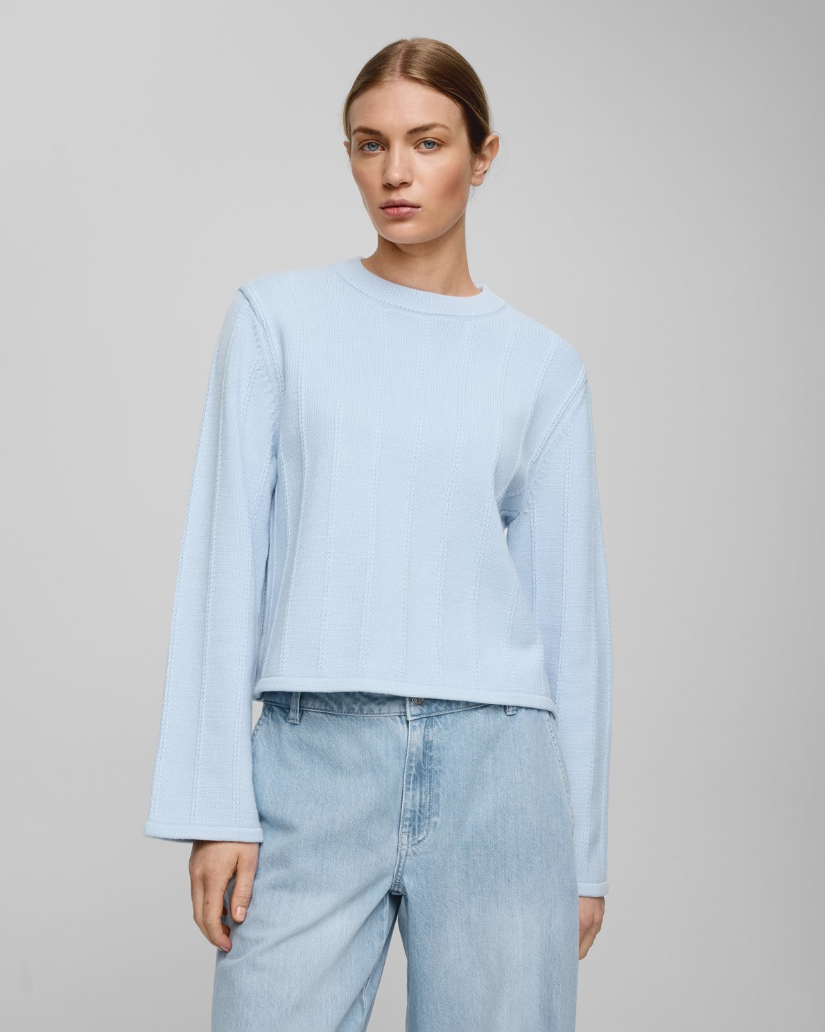 This pullover has a regular fit. The model is 179cm and wears a size S/M.