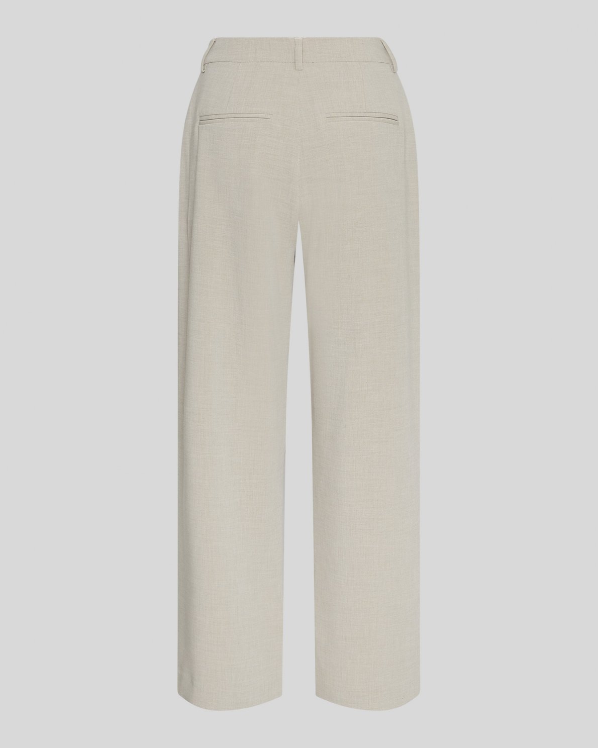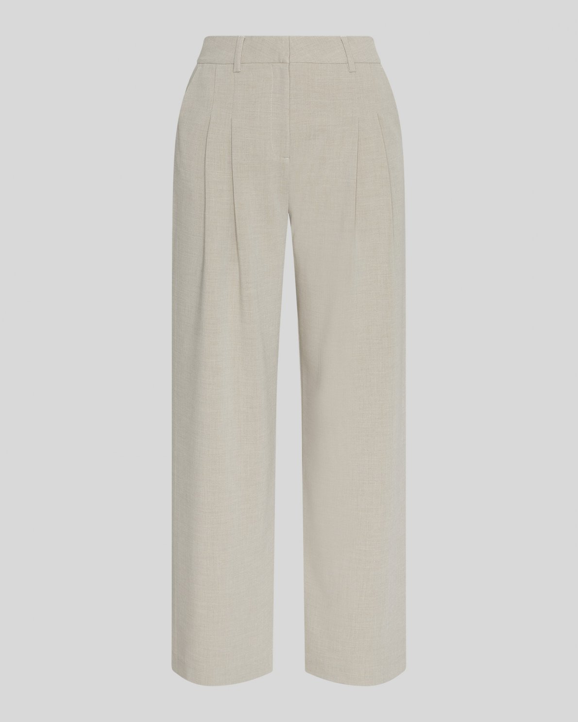 Die Mirabelle Anzughose ist eine weiche, hochgeschnittene Hose mit weitem Bein, Bundfalten und Seitentaschen. Der Farbton ist ein warmer, melierter Beigeton.