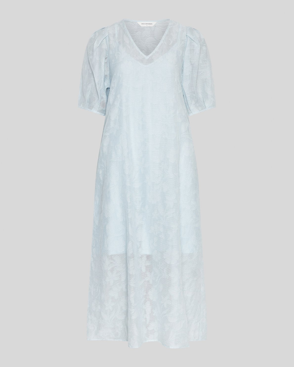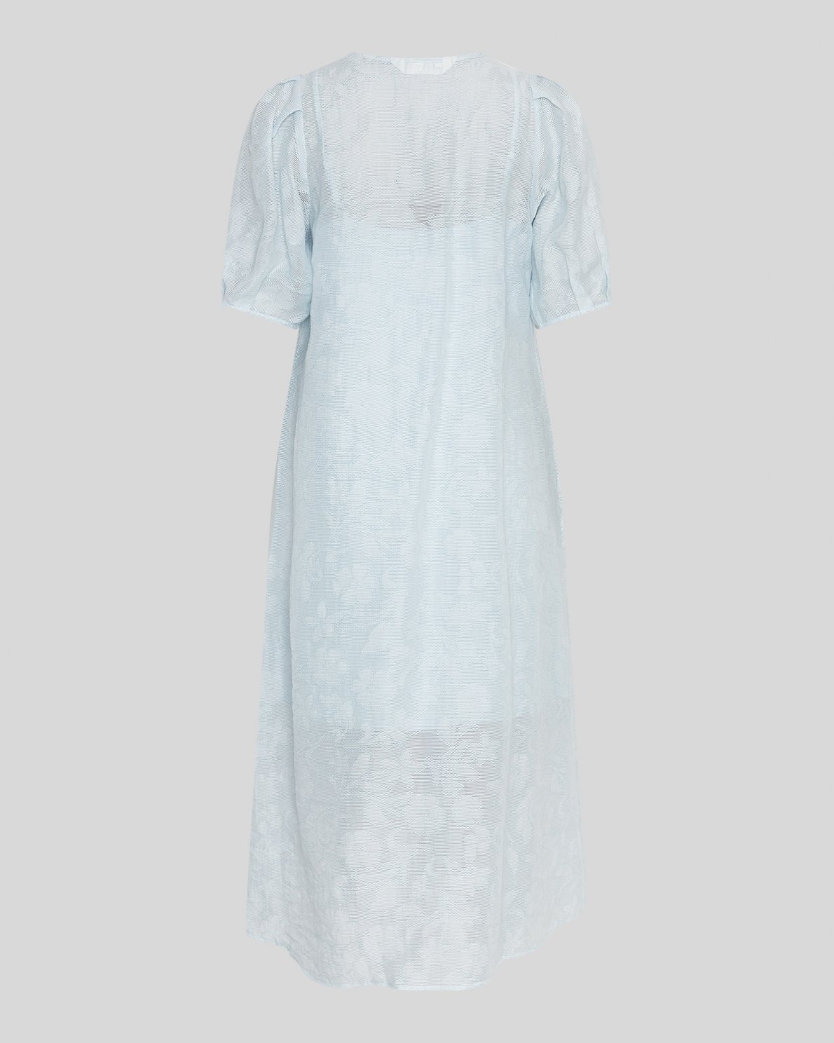 This dress has a unique design with its transparent jaquard print. It also features volumious sleeves, a deep v-neck and a pettycoat underneath to ensure coverage.