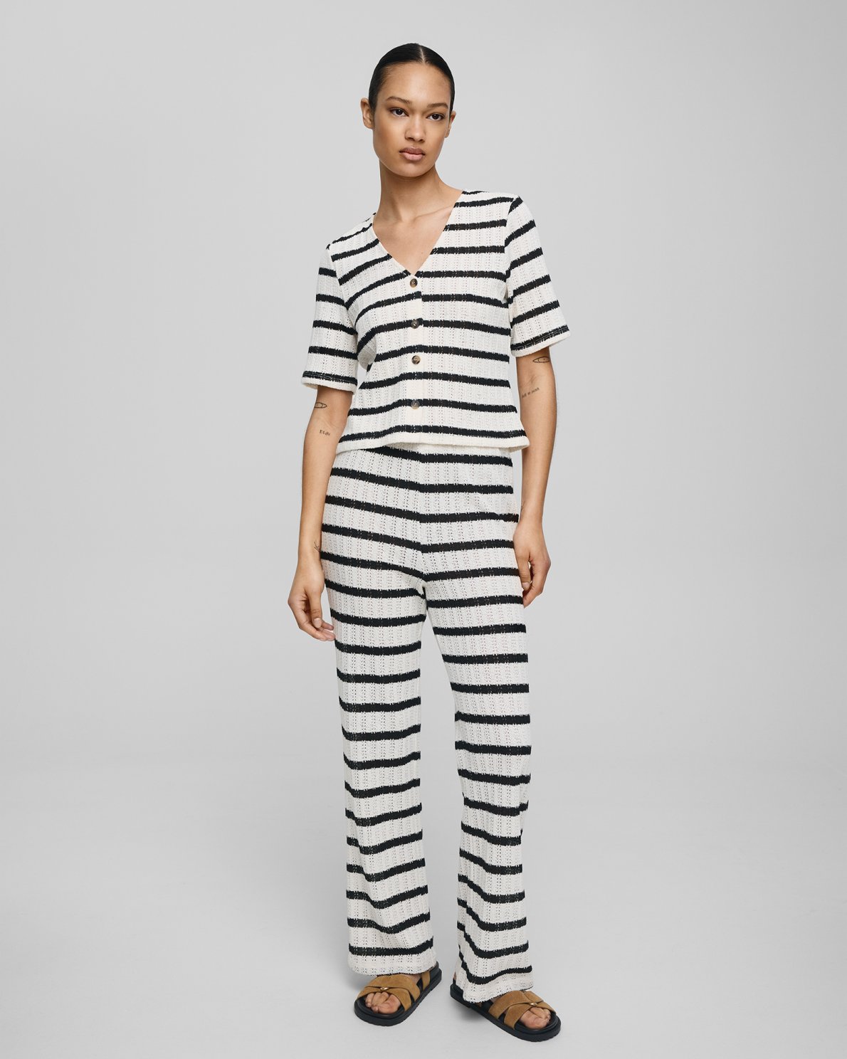 These pants are knitted, in a heavy cotton and polyester quality, to ensure both comfort and longelivity. The pants are minimally flared and with an elastic waist. Style them with either the matching Kenja top, or with an oversized shirt, for a cool look.