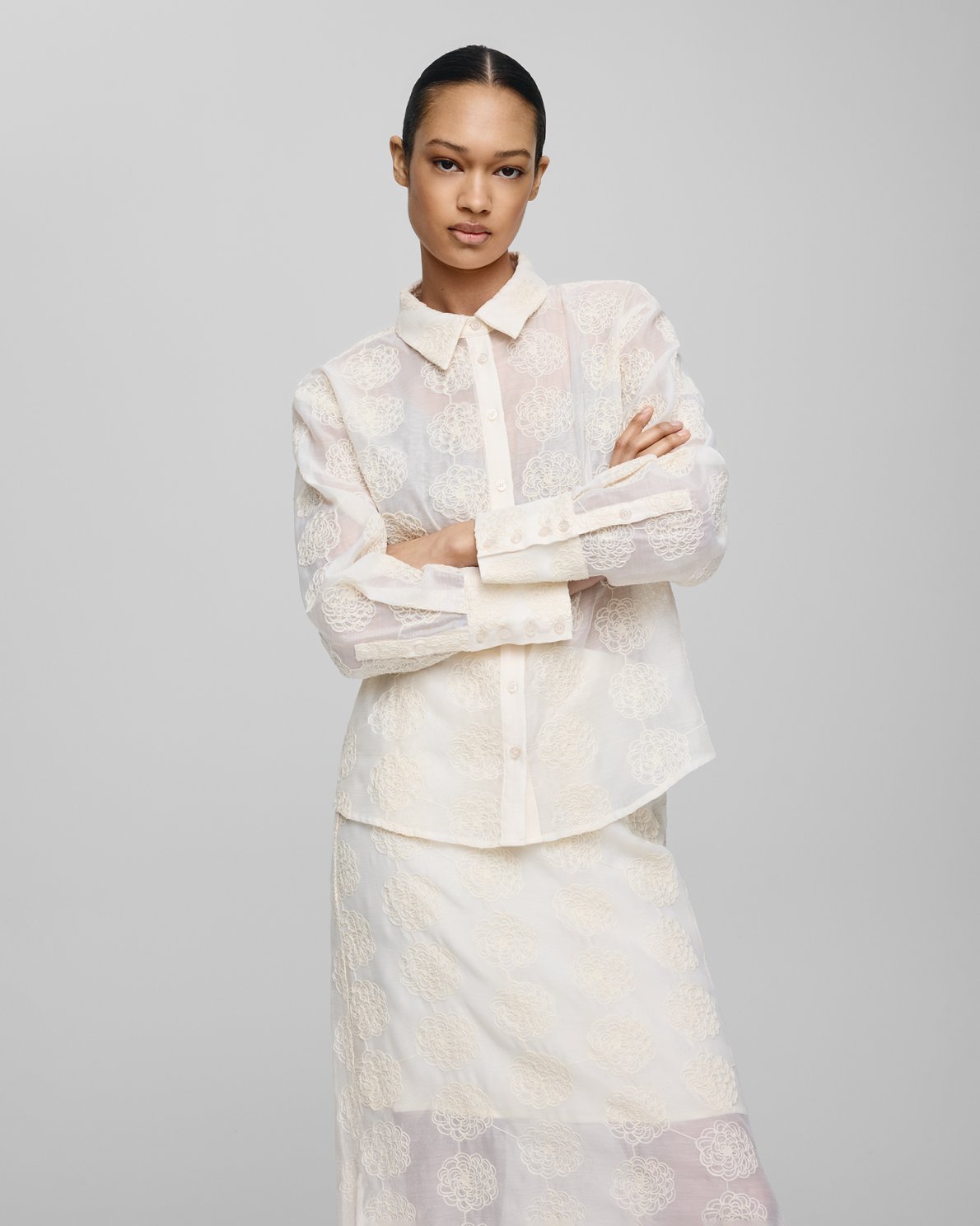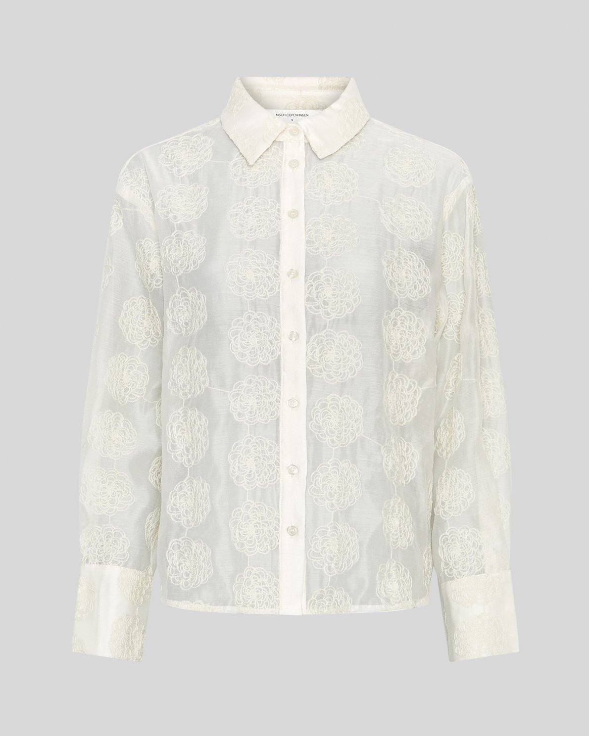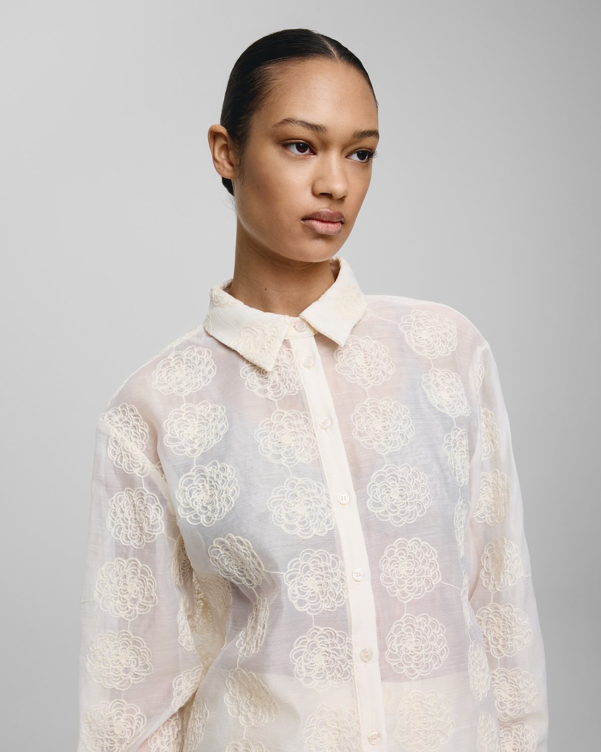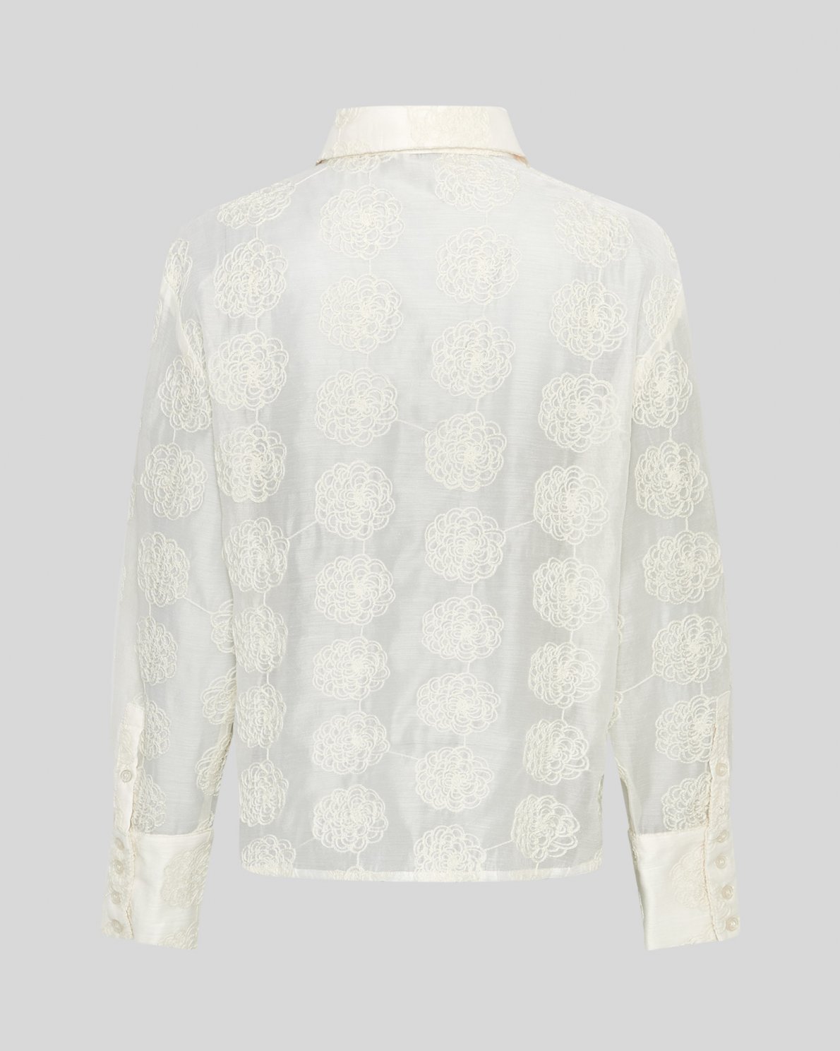 Alaina is a floral embroidery on a mesh quality. The shirt features a seethrough design with colourblock details as the collar, placket and cuffs are fully lined. It creates a beautiful contrast.