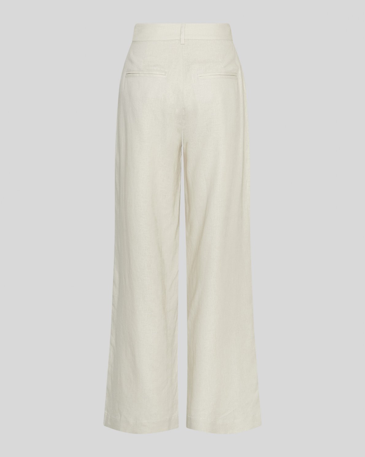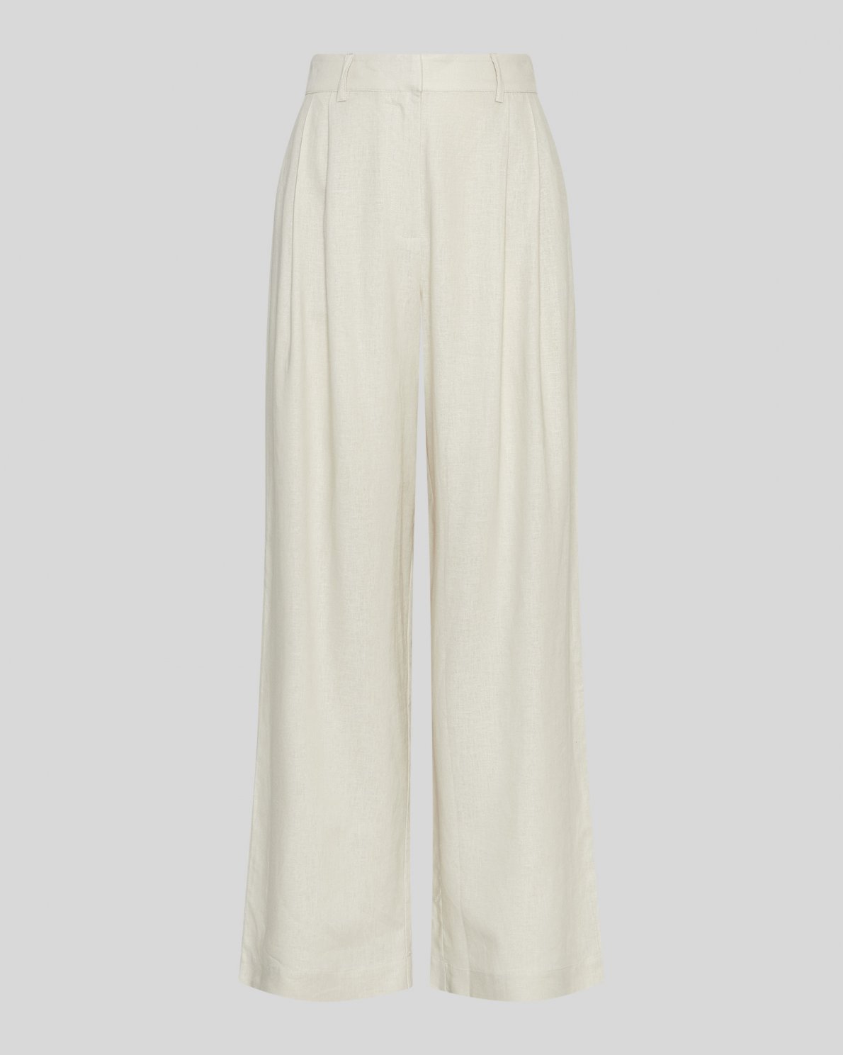 The Ryan Conella pants is a highwaisted suit pant with front pleats and wide legs. The material is a soft cotton and linen blend, perfect for summer, as it's lightweight and breathable.