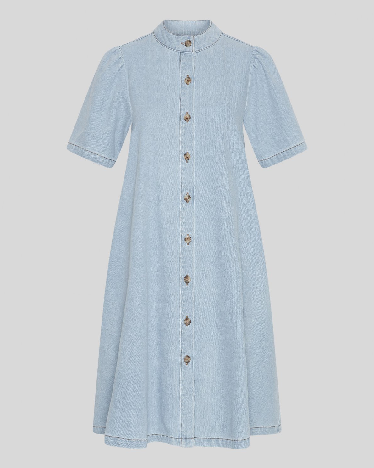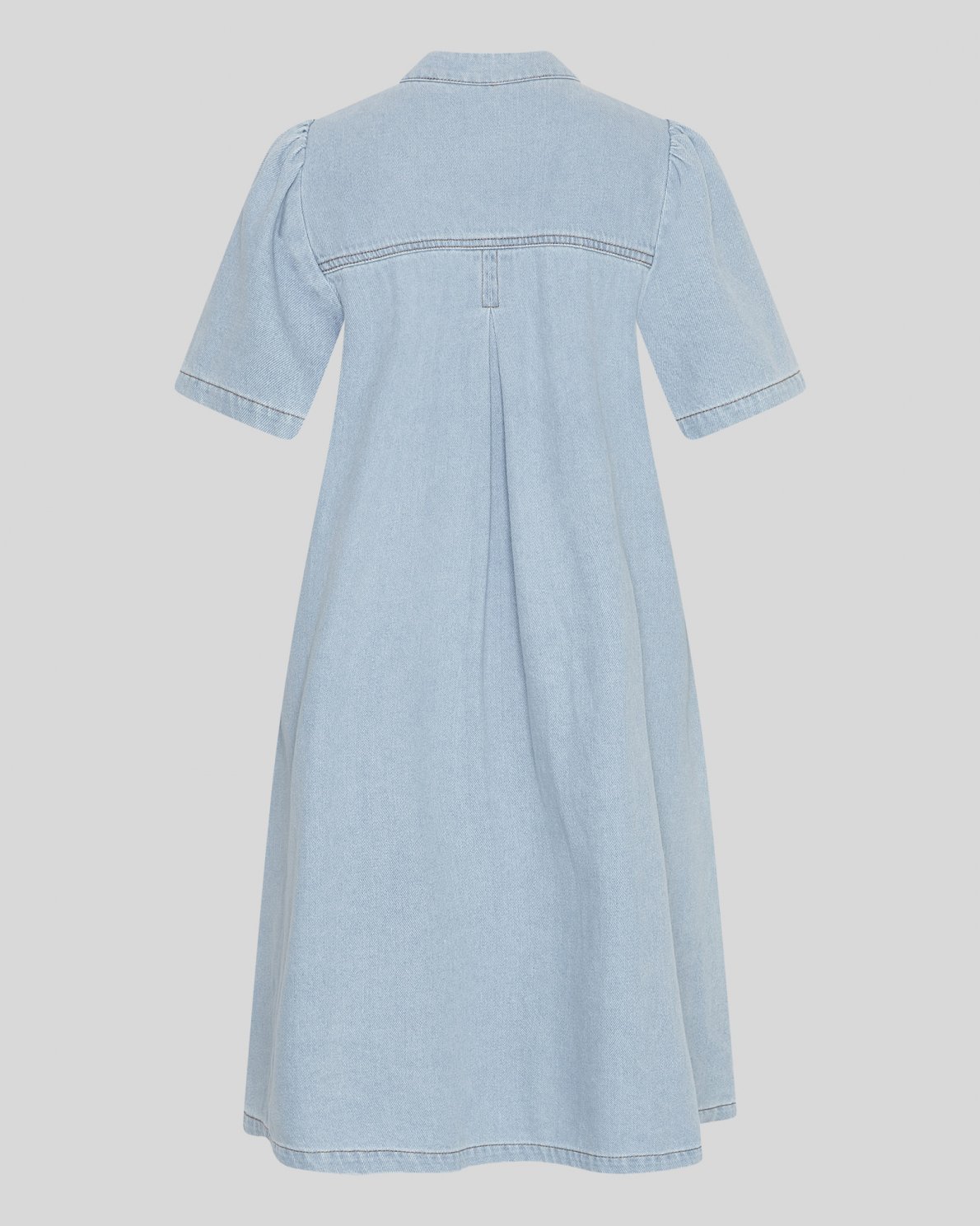The Jolene collection is a new series of denim styles, curated for spring and summer. This dress is a shirt dress, meaning it has a button placket all the way down the front. It features a collar, 2/4 sleeves and a cool contrast stitching.