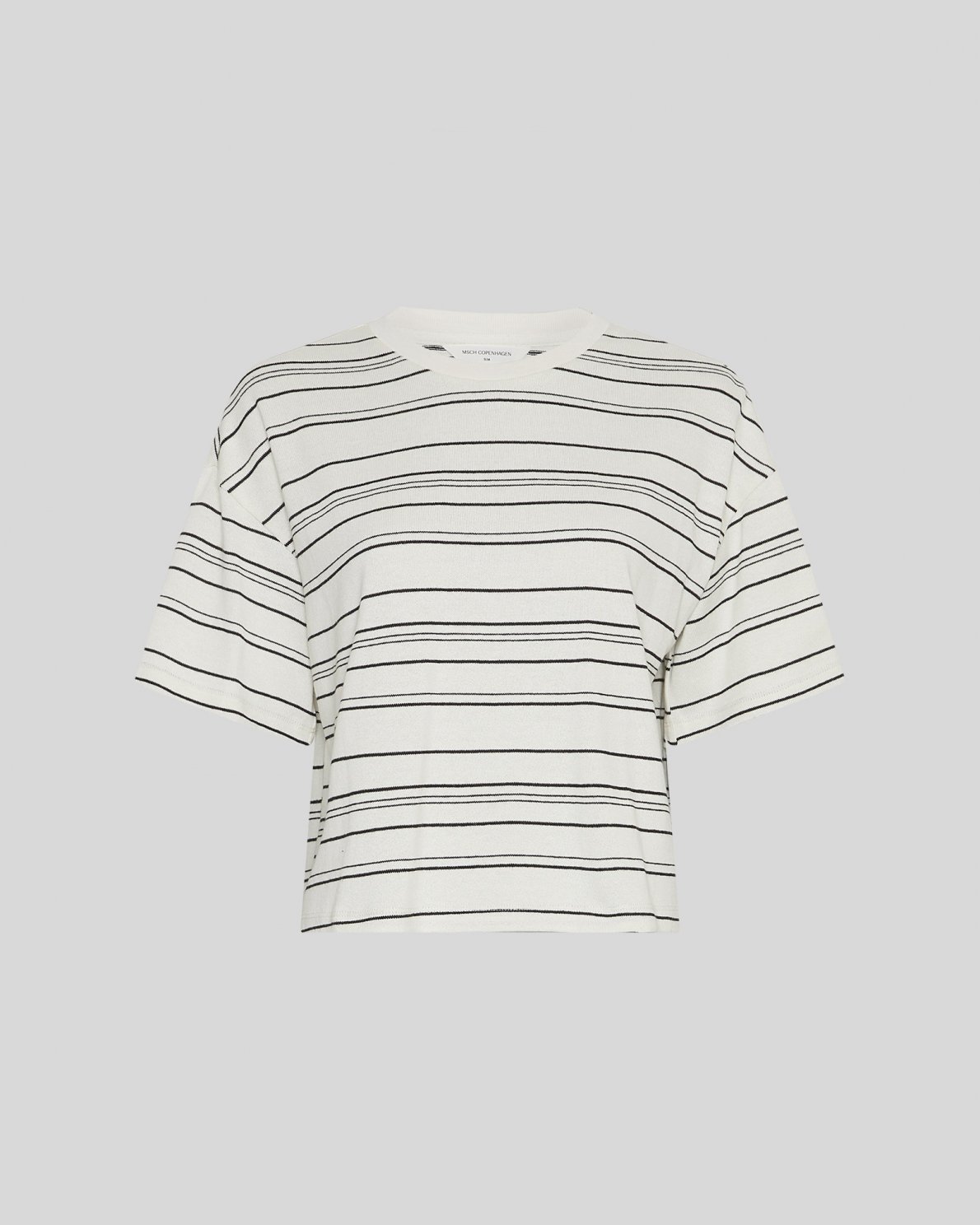 This T-shirt has a boxy fit. The model is 176cm and wears a size S/M.