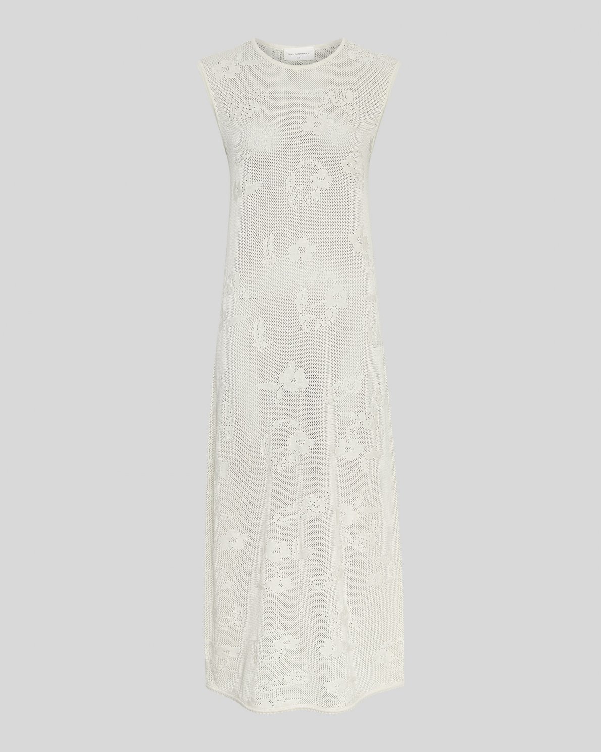 The Sunday dress, is a long dress in a pointelle knitted quality, with a jacquard pattern. It's lace, i't s floral, it's ideal for a summer holiday or over a pair of jeans.
