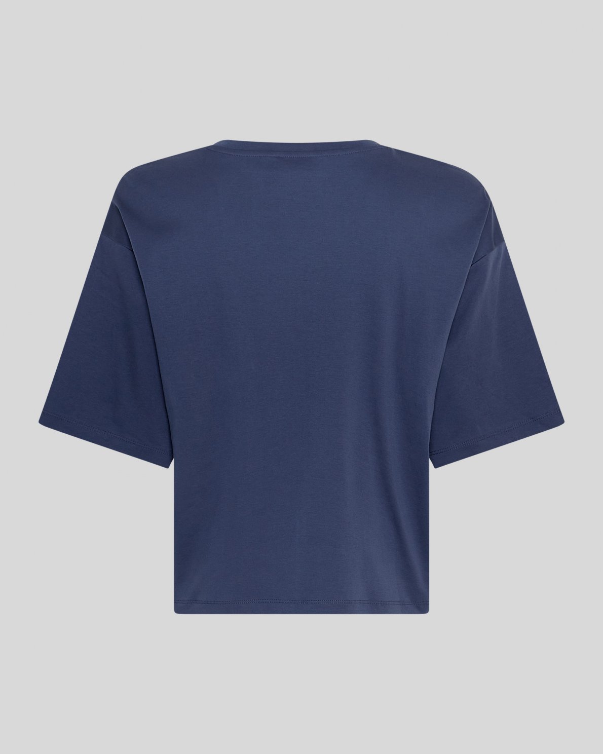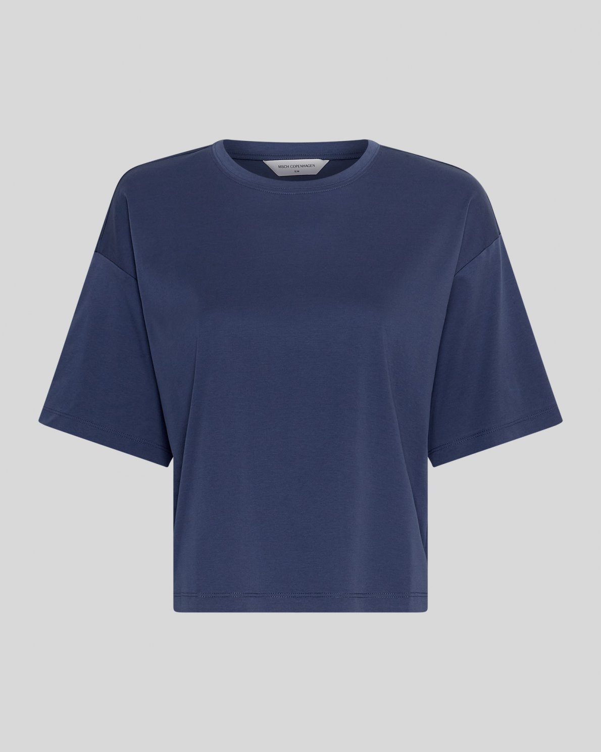 Our Moa Melea tee is a boxy fitted basic tee, that you can wear over and over again. The T-shirt has a classic round neckline and a "long" sort sleeve with dropped shoulders.