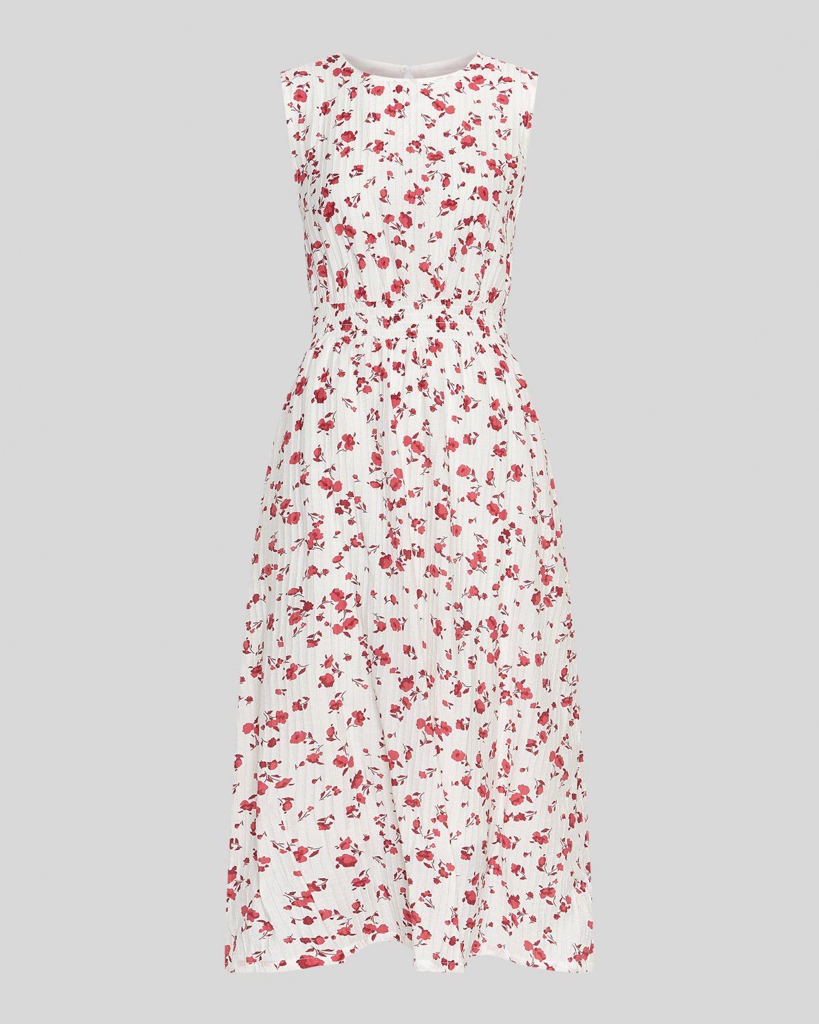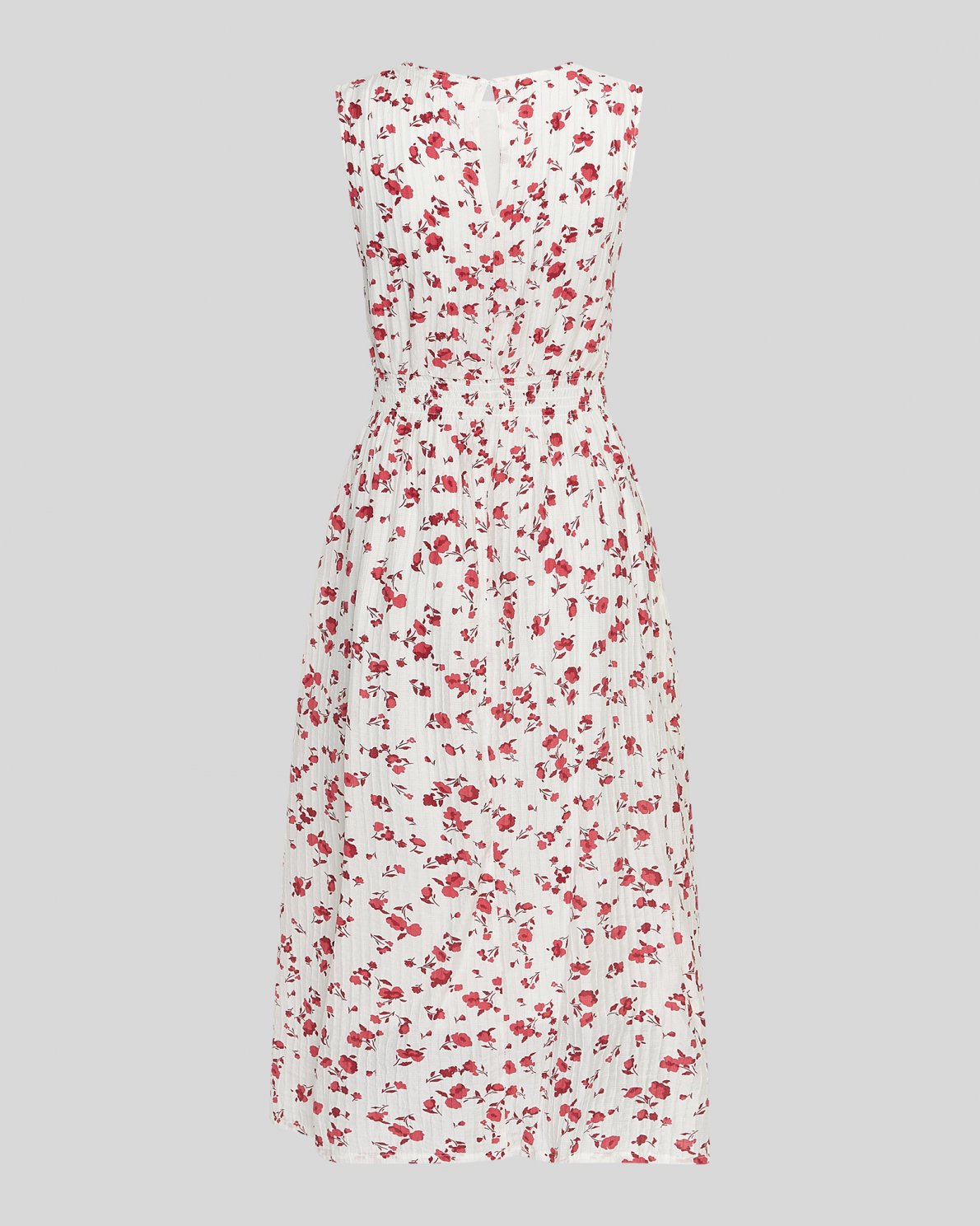 Falisha is a textured material in a floral print. This dress has a sleeveless design with a smock design around the waist. It's the essence of summer.