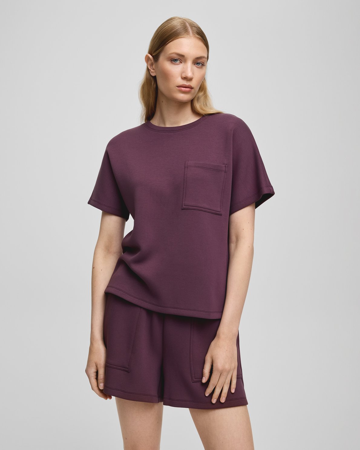 An oversized t-shirt mixed with a sweatshirt. We have the beloved fit of the boxy t-shirt, with the comfortability of a soft sweatshirt. This sweatshirt features wide short sleeves, a round neck and a front pocket. Style it with the matching shorts for a full sporty look.