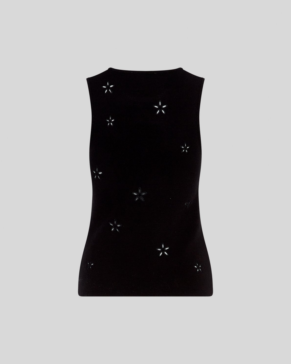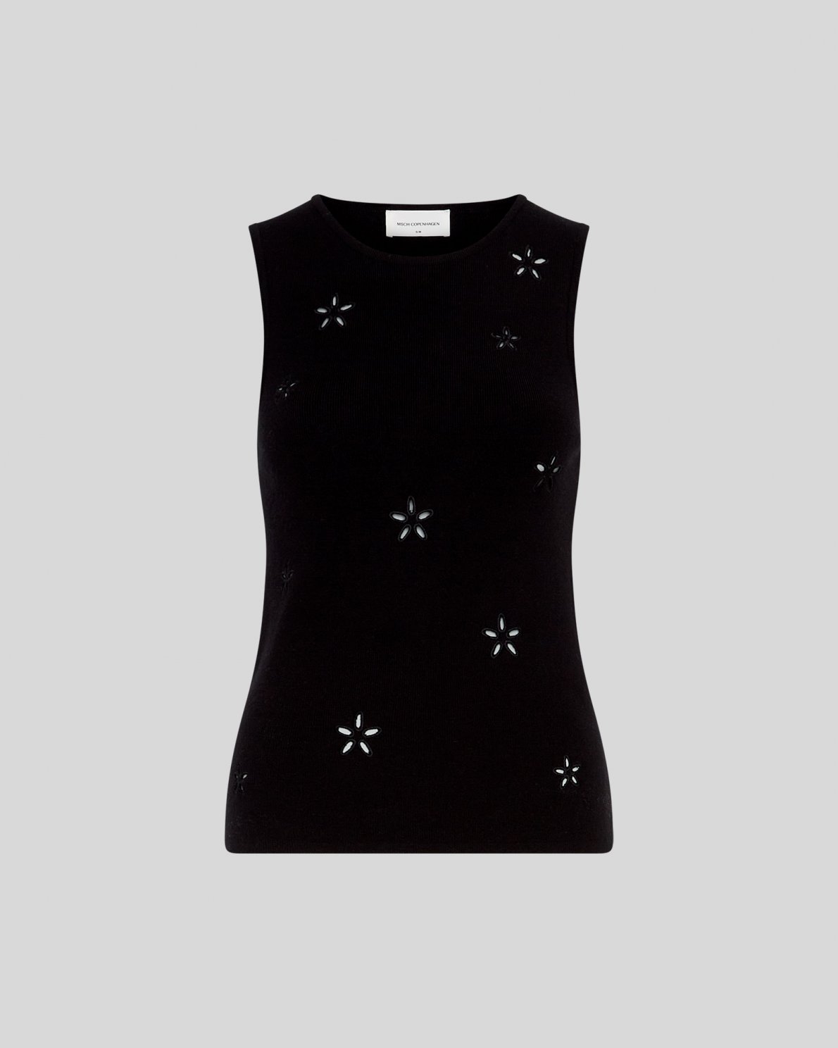 The Christyn top is a sleeveless top in a soft and very fine knitted quality. It features a big embroidery, floral pattern which gives this top a breezy feeling. STyle it with a pair of jeans to mix the feminine and the cool aestethic.