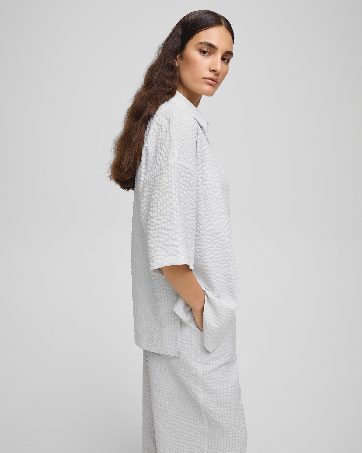 Groove is a thin, new quality with a checkered texture. The shirt is 2/4 sleeved, has a long fit and features a collar and full placket. This shirt is the embodiment of summer, and can be styled both closed or open with a white tank top underneath, for a more casual look.