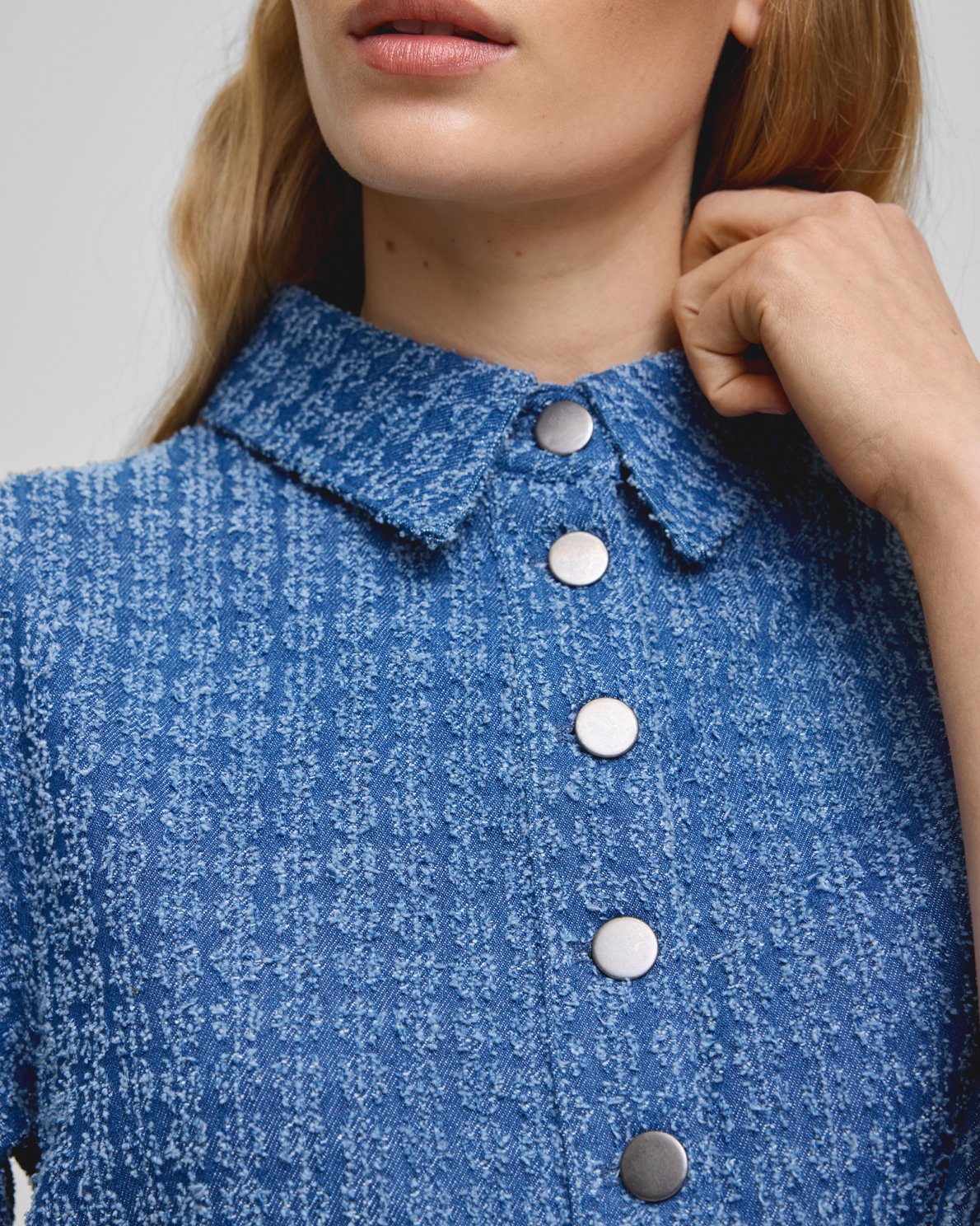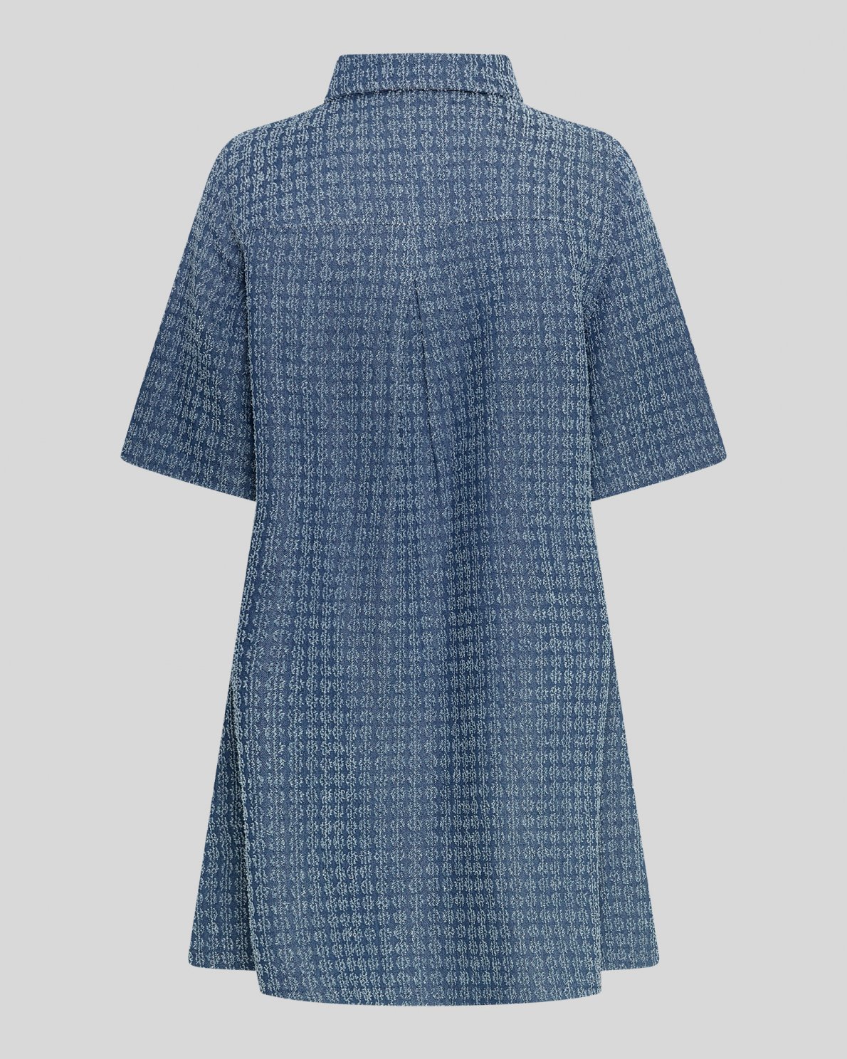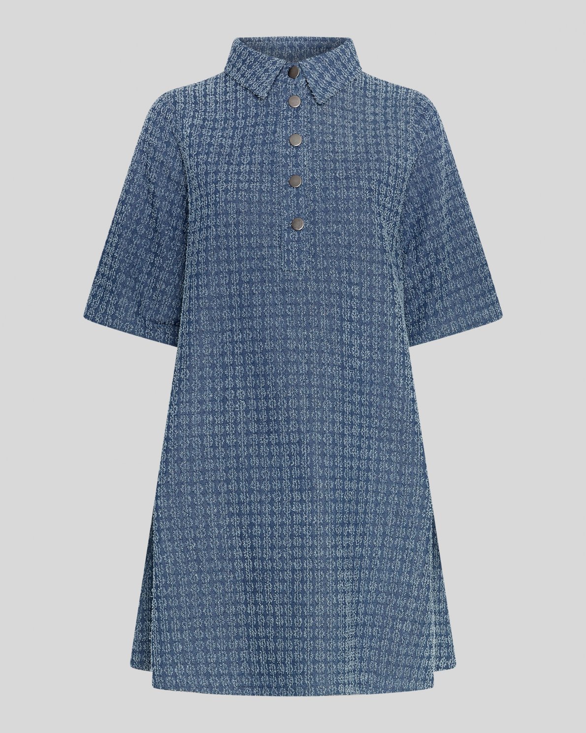 Ibo is a classic A shaped dress with buttons down the chest. It features a shirt like collar and 2/4 sleeves. The material is a denim inspired look-a-like and has a structure to it which gives this checkered pattern.
