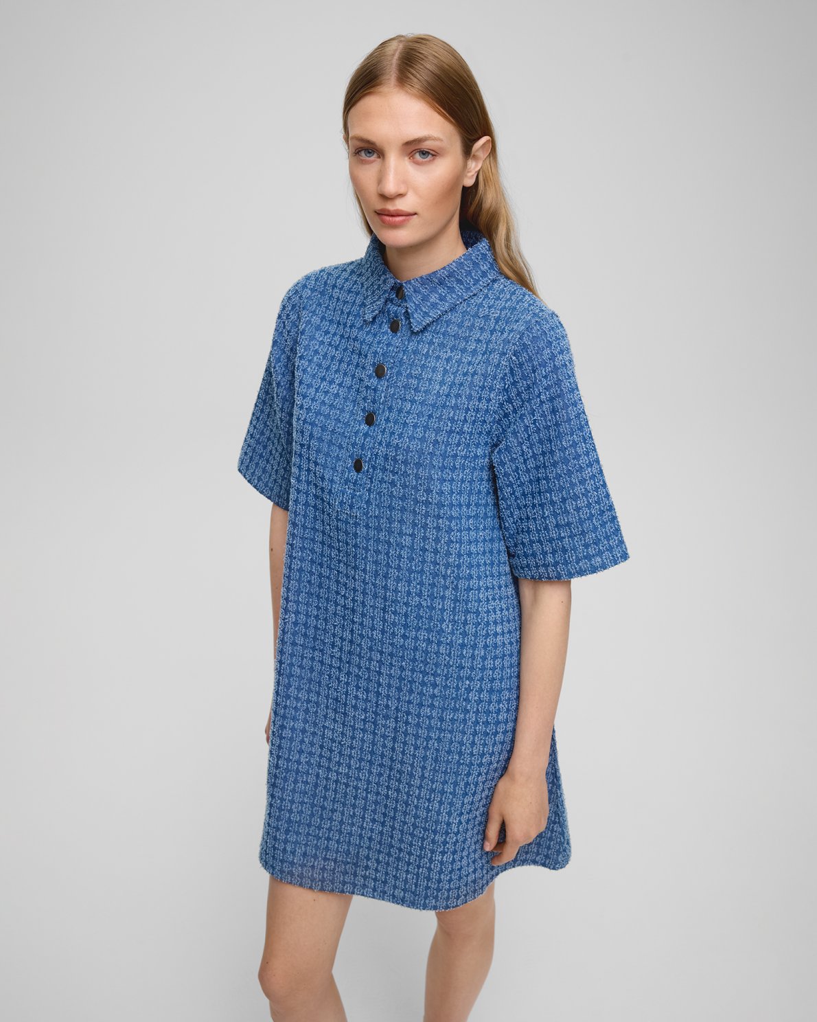 This dress has a loose fit. The model is 179cm and wears a size S.