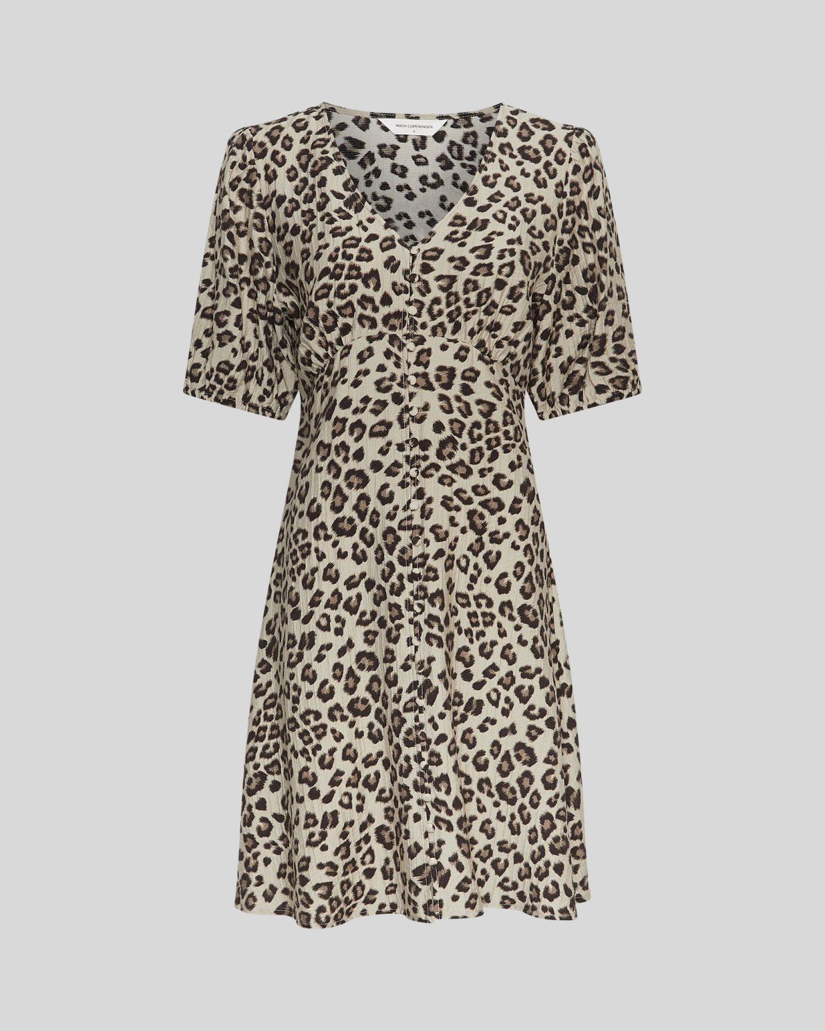 The MSCHKalani Vlora 2/4 Dress AOP is a feminine dress featuring a loose fit for all-day comfort. The elegant cutline and gathered details accentuate the waist, creating a flattering silhouette. A classic v-collar and button closure add a timeless touch, while the short sleeves make it ideal for warmer days.