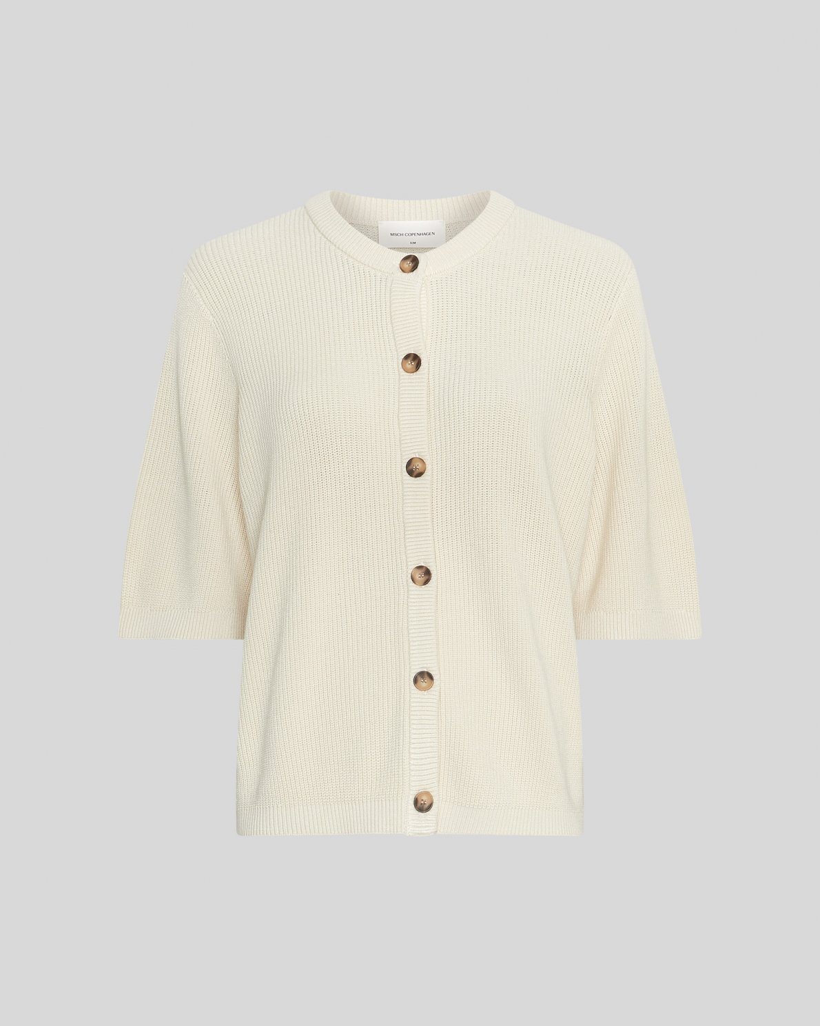 Soft structure meets subtle contrast. The Thamira Cardigan is crafted in a light beige rib knit with a classic O-neckline and elegant 2/4 sleeves. Dark buttons add a bold contrast, elevating this everyday essential with just the right amount of detail. Wear it buttoned up as a top or layered over a tank or dress for a timeless layered look.