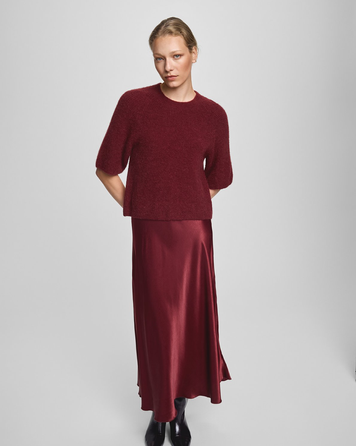 This skirt has a regular fit. The model is 179cm and wears a size S.
