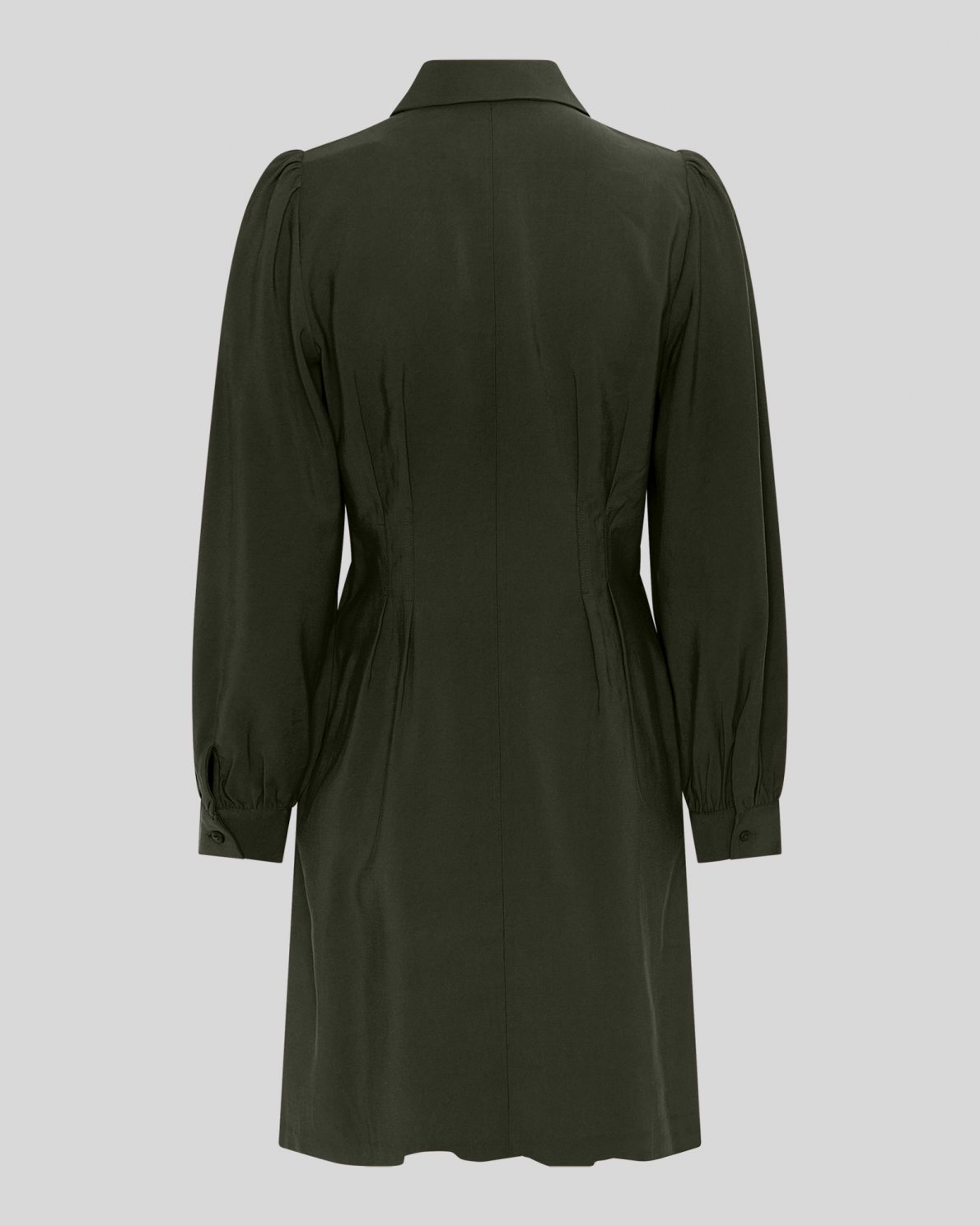 This dress has a shirt like look, but with vertical lining around the waist to enhance your figure and give the dress a slight tailored fit. It features long balloon sleeves with a small puff, a shirt like collar and full length button closure.