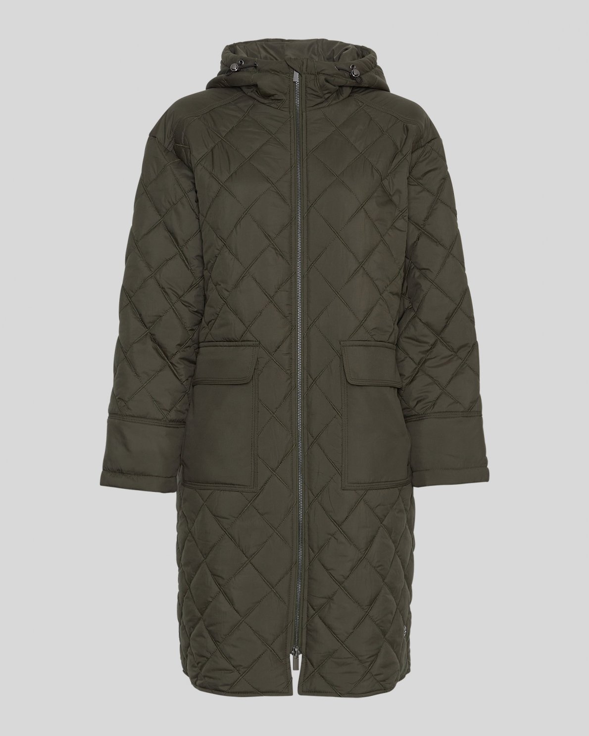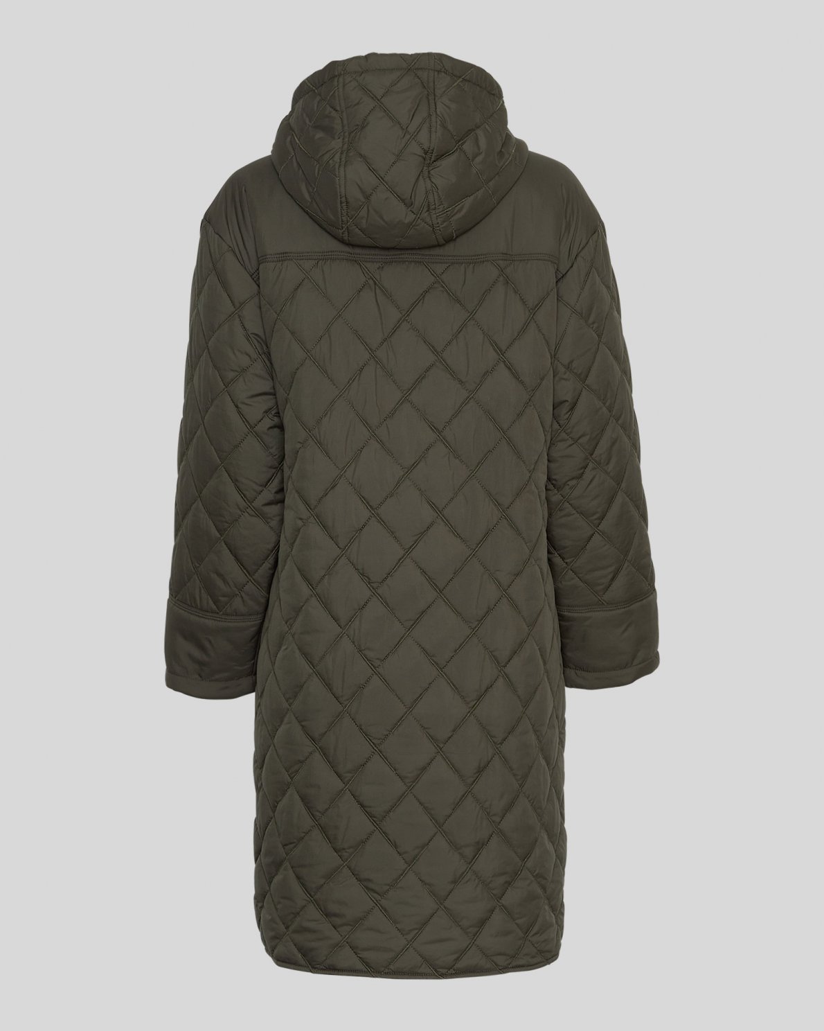 Stay warm in style with the Nichella Jacket. This long, quilted coat is designed with a diamond stitch pattern that adds a touch of elegance to its functional form. Featuring a full-length zipper, large patch pockets, and an adjustable hood, it combines comfort and practicality. The relaxed fit allows for easy layering, making it perfect for chilly days.