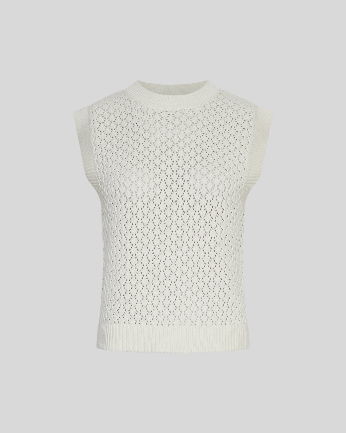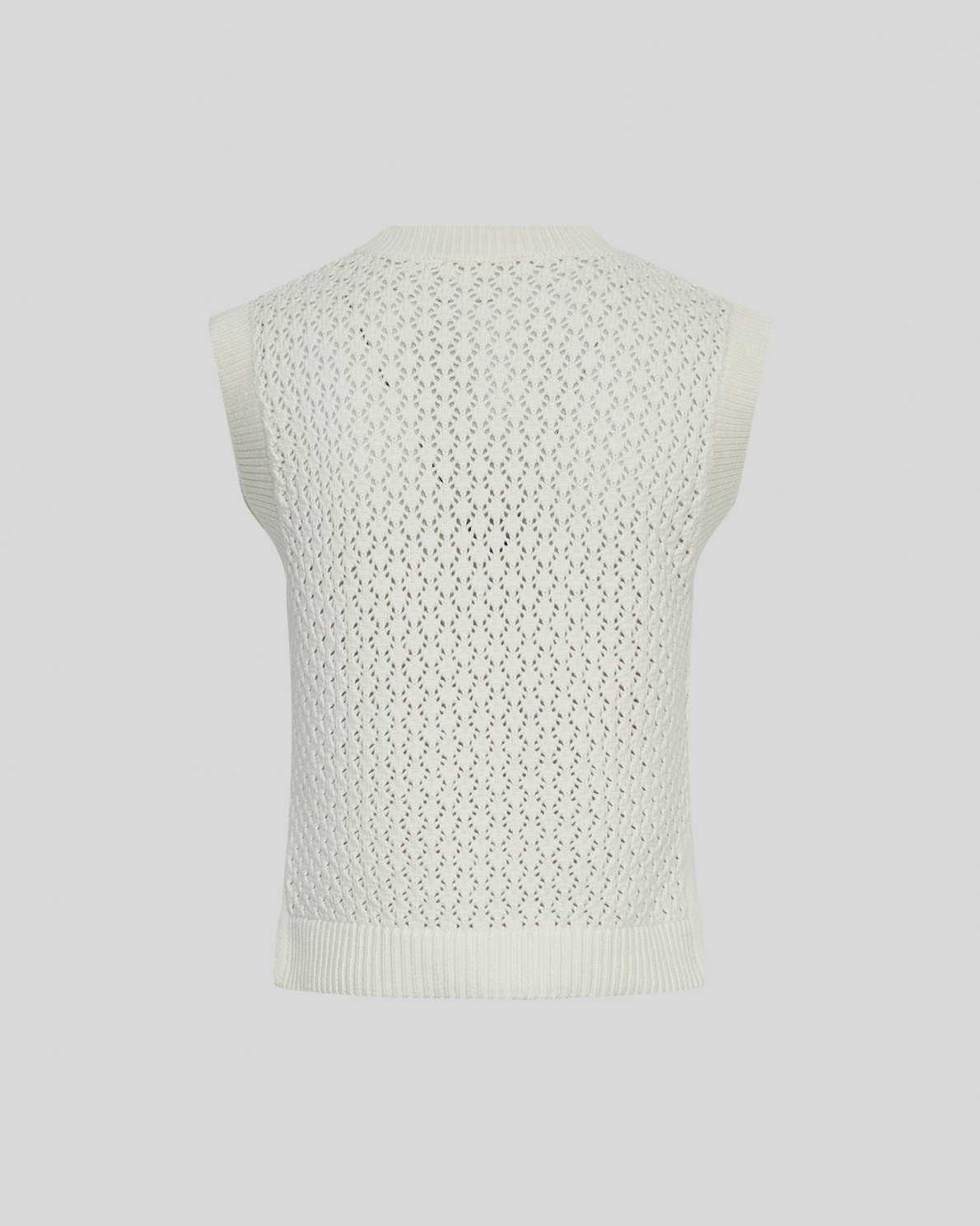 Die Daina Vest ist ein feines Strickmodell im gleichen atmungsaktiven Lochmuster wie der Cardigan. Sie hat einen klassischen Rundhalsausschnitt sowie gerippte Abschlüsse am Halsausschnitt, an den Armausschnitten und am Saum. Ein vielseitiges Kleidungsstück, das sich sowohl für wärmere Tage als auch für die Übergangszeit eignet.