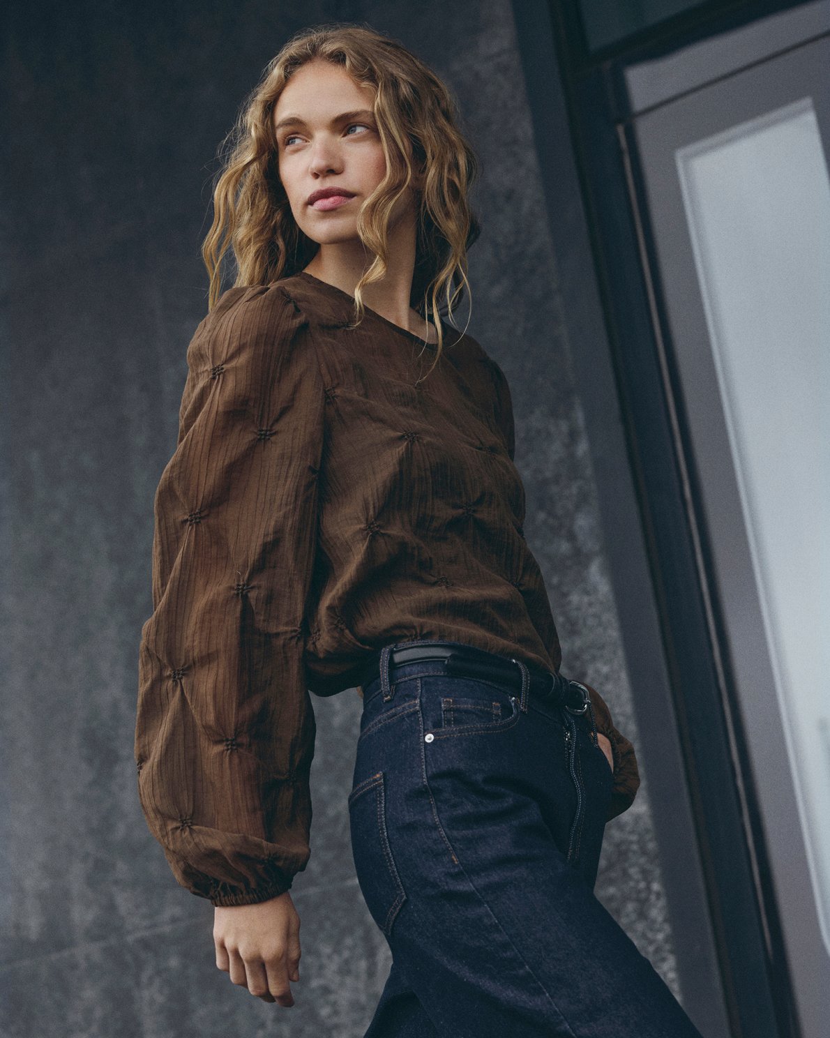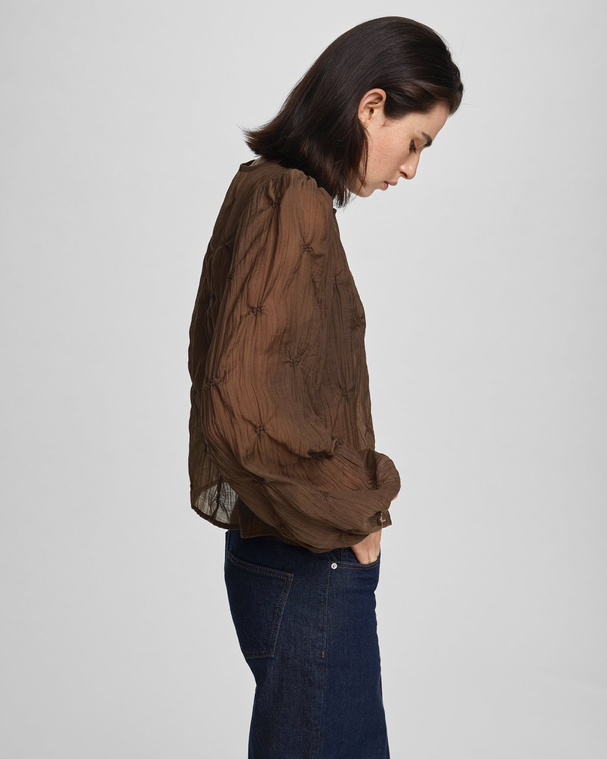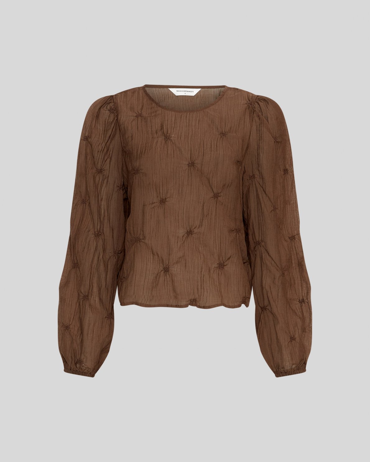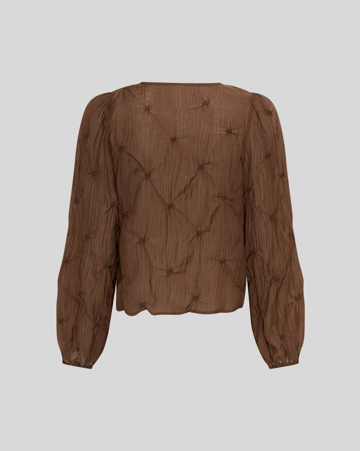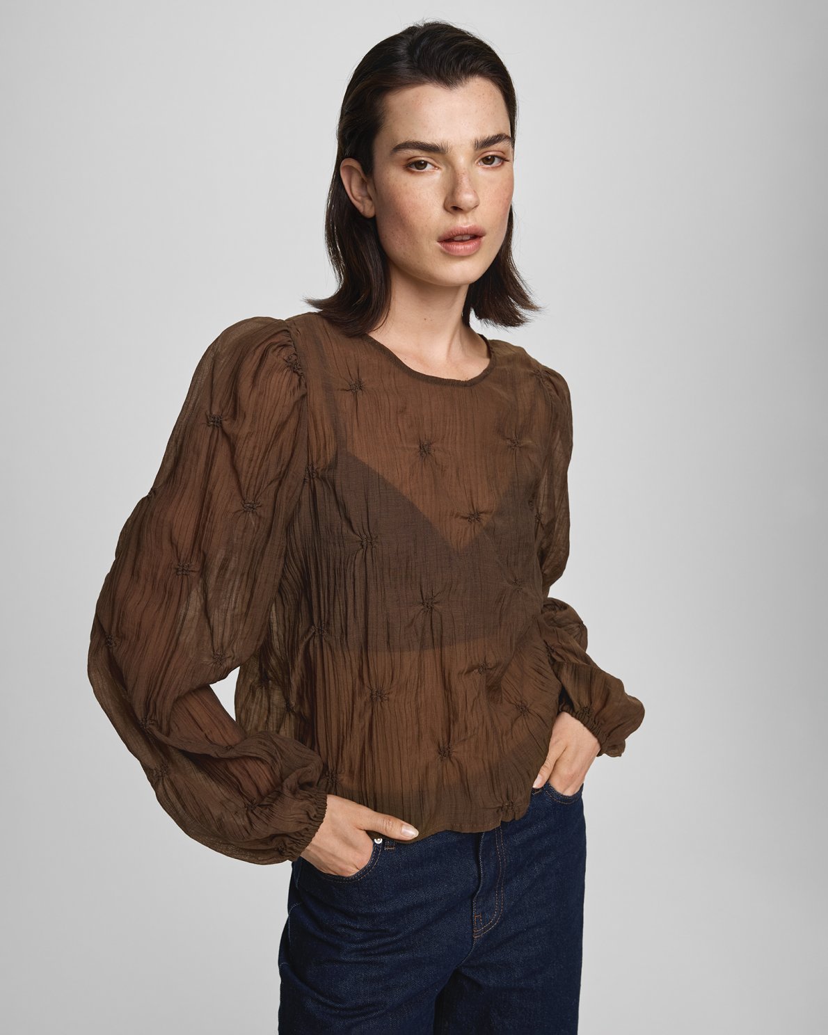 Our Caroline top is a feminine top in an almost seethrough material and added is small, almost flower looking gatherings all around to create a pattern but also this elegant touch. The Top has a round neck, with long sleeves and slim elastic cuffs.