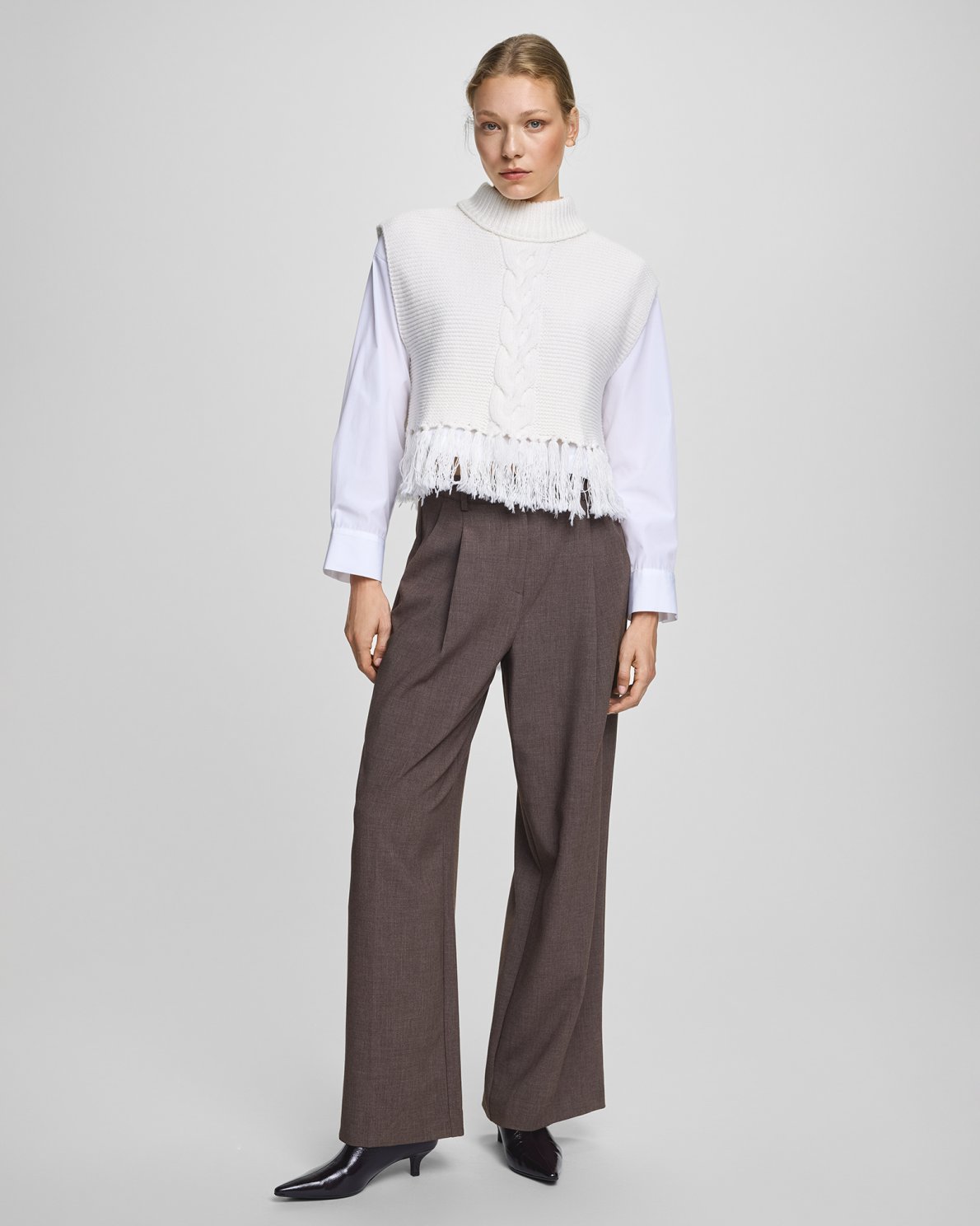 Die Esmai M Weste ist ein stilvolles Strickstück mit einem Zopfmuster auf der Vorderseite. Sie verfügt über einen Stehkragen und einen markanten Fransenbesatz am Saum, der verspielt und zugleich elegant wirkt. Der ärmellose Schnitt macht sie ideal zum Kombinieren über Blusen oder Kleidern und vereint Textur mit angenehmer Wärme in einem eleganten Design.
