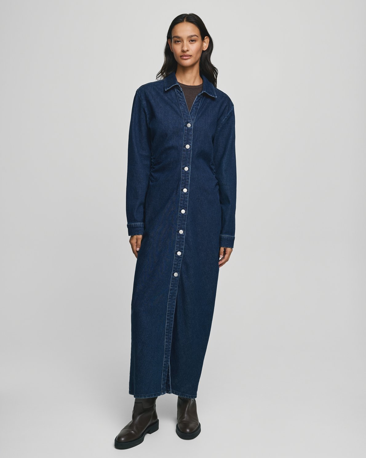 The MSCH Mow Shirt Dress is a long denim dress featuring a classic shirt collar and full button-down front. Its long silhouette combined with defined stitching creates a timeless and clean look, making it suitable for both casual days and dressier occasions. Style it with sneakers for a laid-back vibe or pair it with boots and accessories for a more sophisticated outfit.