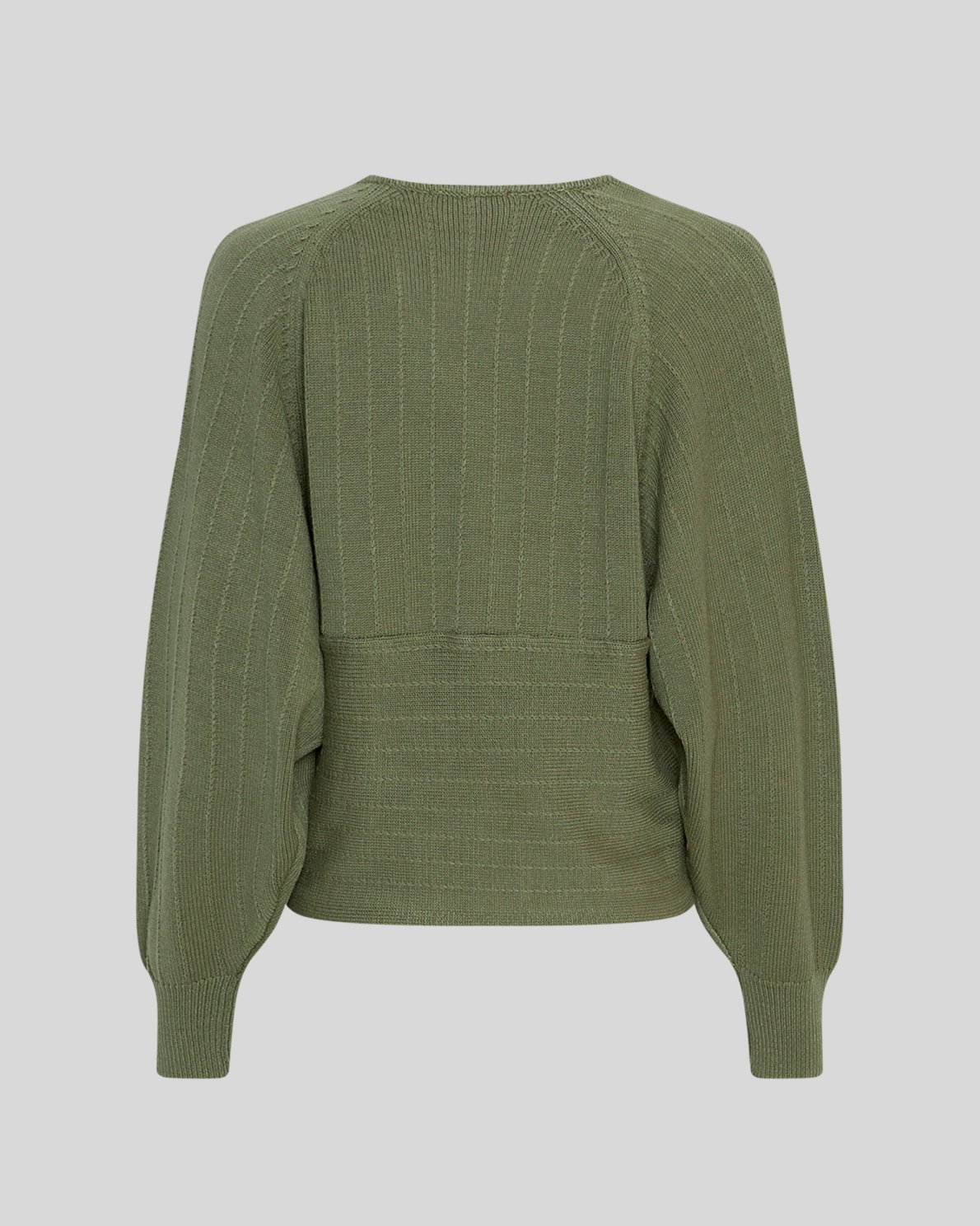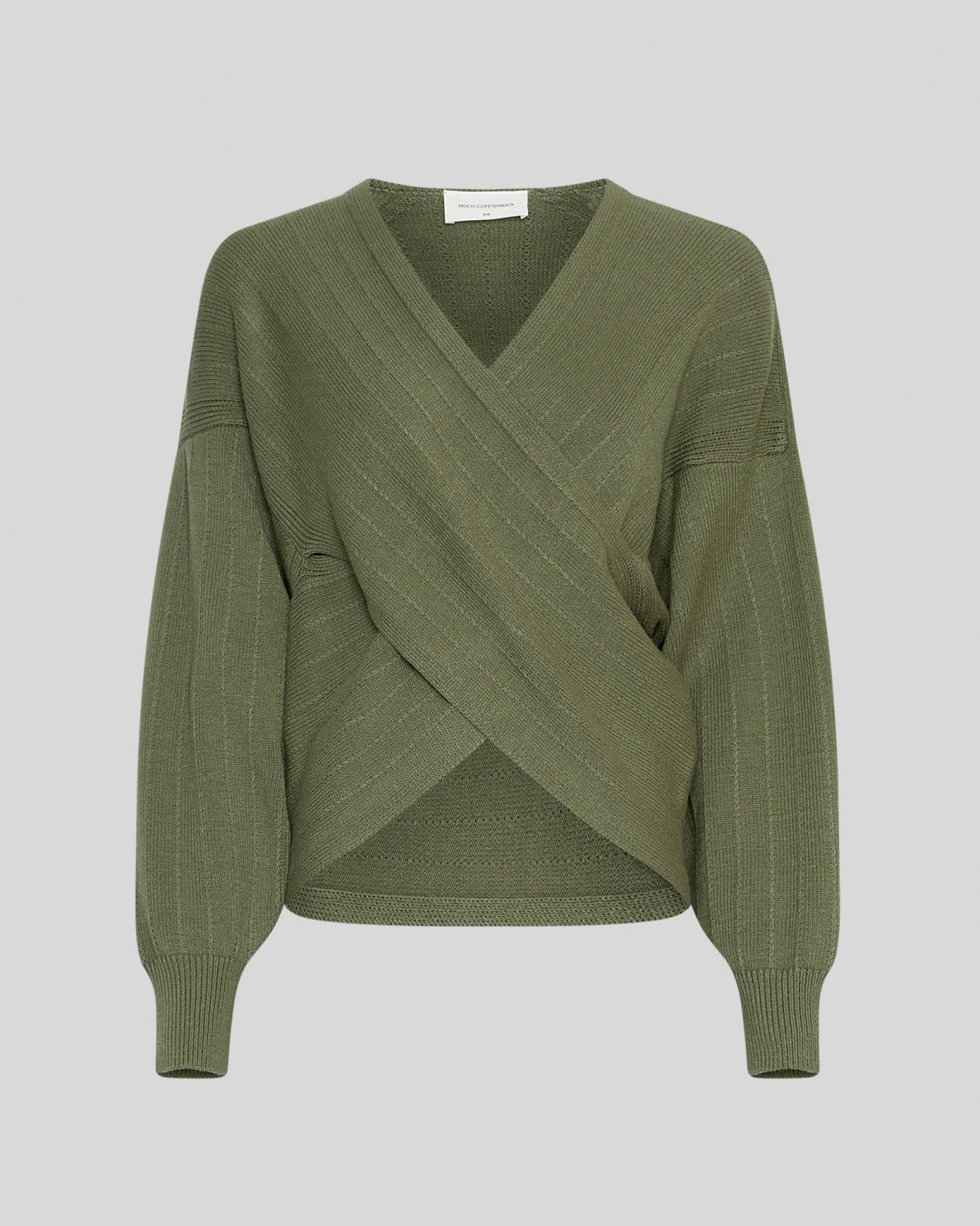 Wrap yourself in style with this chic pullover that offers a blend of timeless sophistication and modern flair. The half cardigan pattern adds a touch of intrigue to the classic knit design, creating an exquisite visual that sets you apart from the crowd. The wrap silhouette drapes gracefully, highlighting your figure and offering a flattering fit for all body types. It features dropped shoulders with a soft, cozy feel. This pullover is a highly versatile stye, seamlessly transitioning from day to night. Whether attending a cozy daytime gathering or a chic evening outing, this pullover exudes confidence and charm. Pair it with black washed jeans for a minimalistic look.