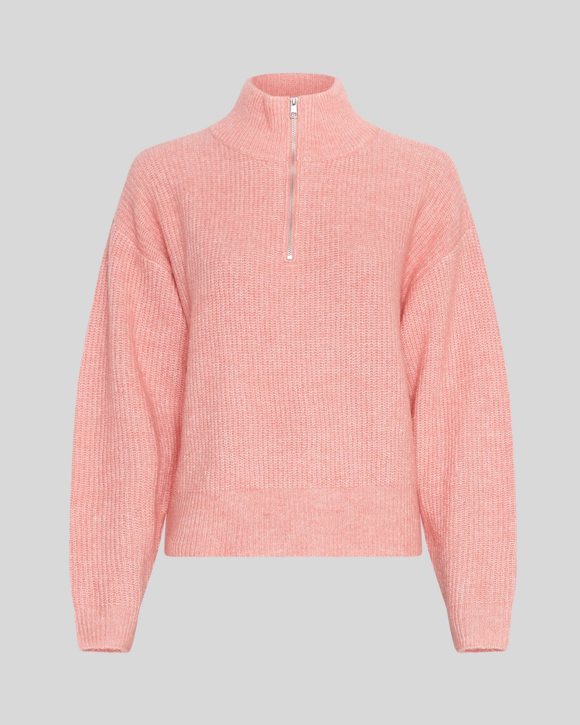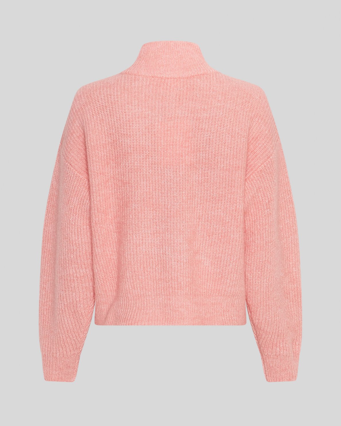 Dieser Pullover hat eine boxy Passform. Der Pullover besitzt einen Stehkragen mit halbem Reißverschluss.