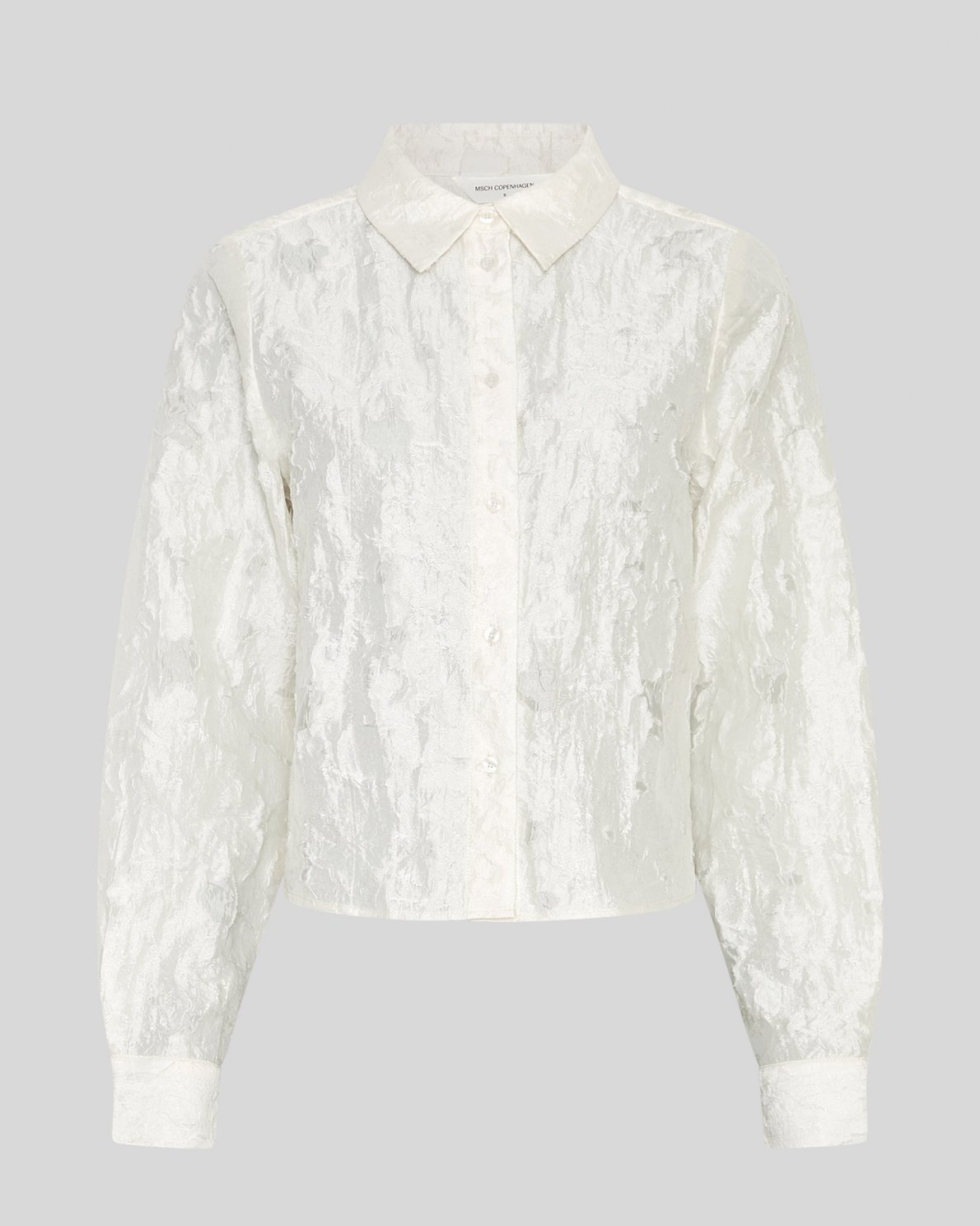 Das MSCHLakshmi Shirt ist eine elegante Bluse aus einem strukturierten, leicht glänzenden Stoff. Es verfügt über einen klassischen Kragen, eine durchgehende Knopfleiste und lange Ärmel mit Bündchen. Die strukturierte Oberfläche verleiht Tiefe und einen exklusiven Look.