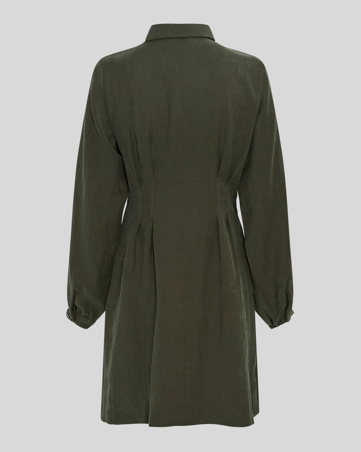 MSCHManny shirt dress is a short dress that shares the same features as a shirt; button down closure and a collar. It also features pleat details around the waist.