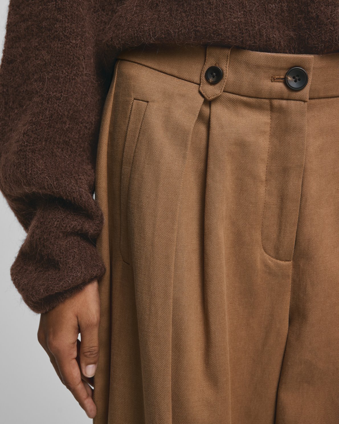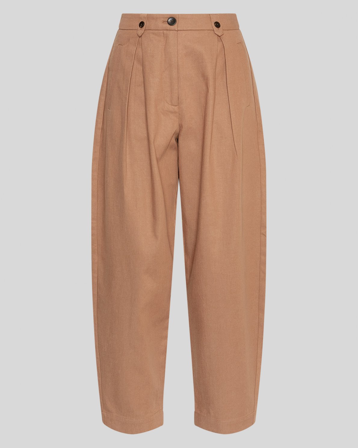 Hose aus gewebtem Material mit weitem Barrel-Leg. Mit hoher Leibhöhe, Gürtelschlaufen, Knopfverschluss und Frontzipper. Mit vorderen Falten, elastischen Einsätzen an den Seiten und rückseitigen Pattentaschen mit Knöpfen.