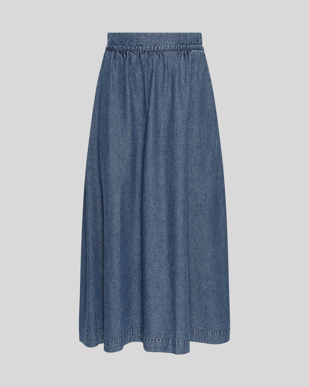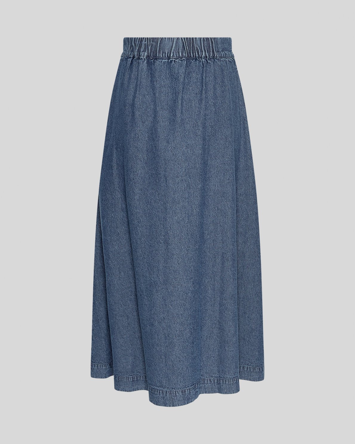 A-Linien-Denimrock mit hoher Leibhöhe. Mit elastischem Bund und langem Saum.