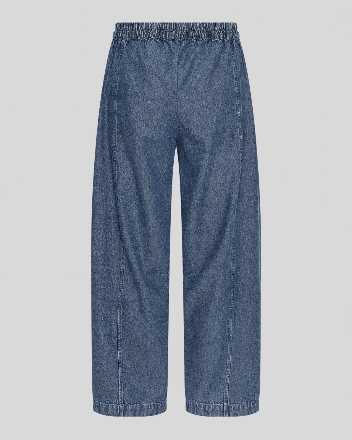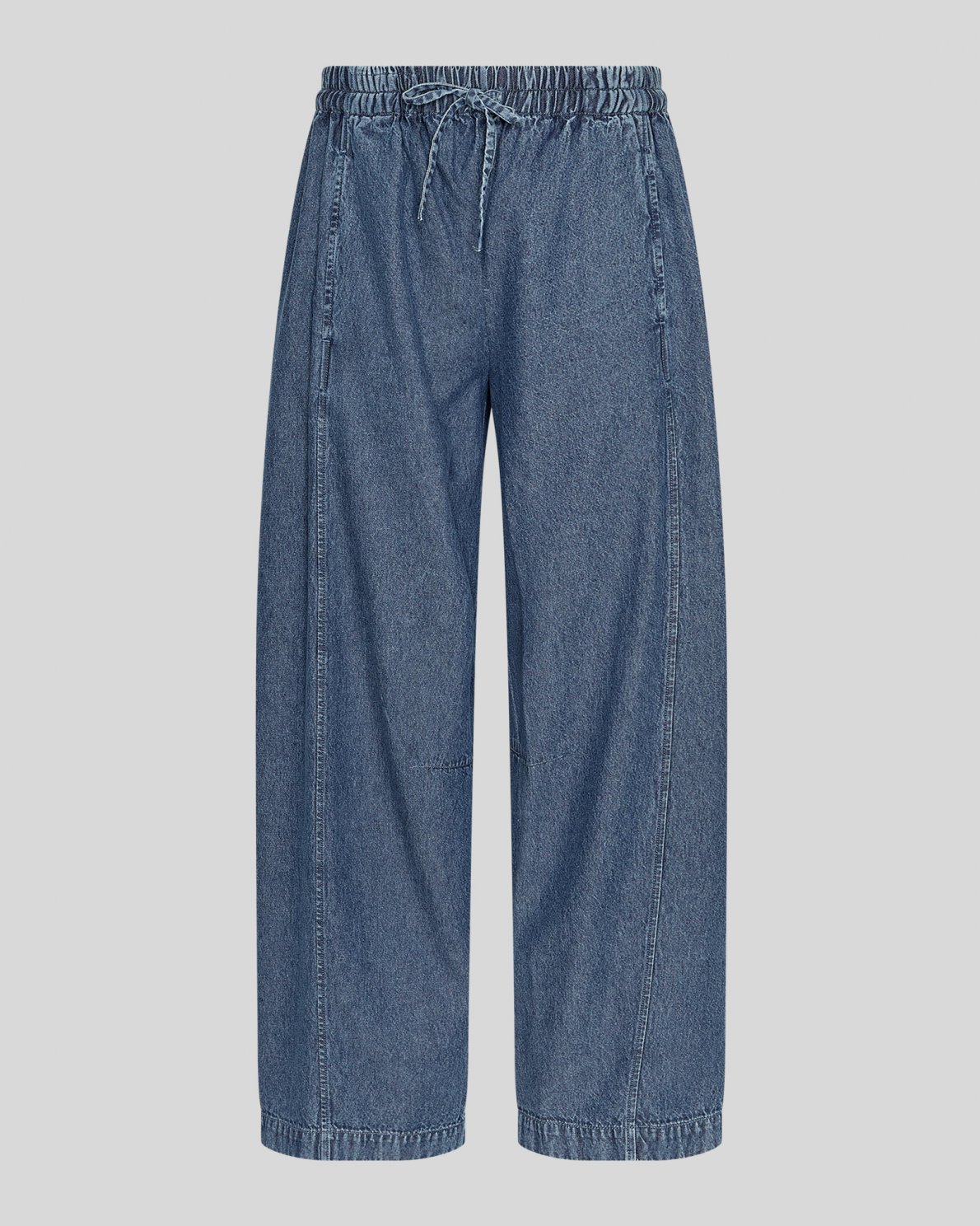 Weit geschnittene Hose aus leichtem Denim. Mit elastischem Bund und verstellbarem Kordelzug, seitlich schrägen Taschen und geraden, weit fallenden Beinen. Mit sichtbaren Nähten vorn und hinten.